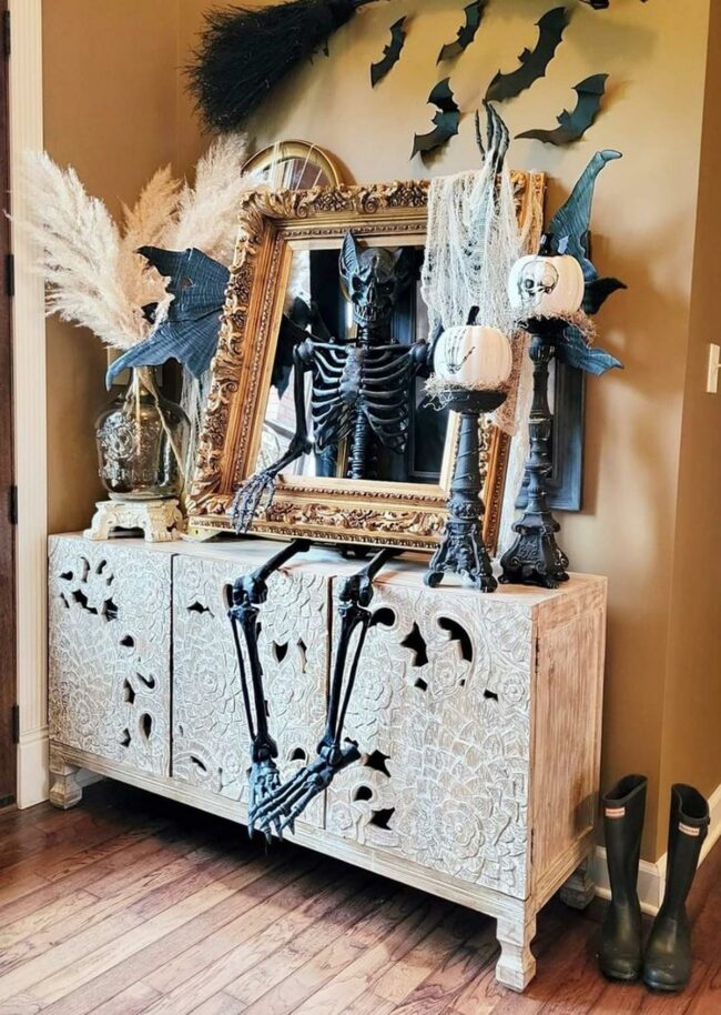 Gold-framed mirrors dramatically reflect the holiday spirit, highlighting whimsical skeleton figures that bring character to the scene.