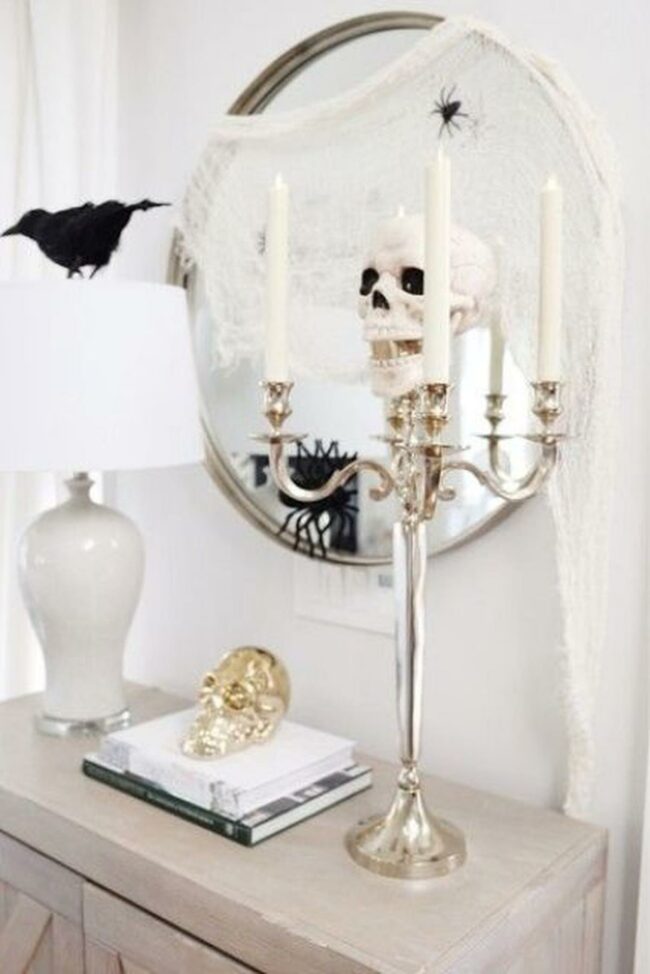 Tall black candle holders display delicate white pumpkins wrapped in gauzy fabric, enhancing the eerie mood.