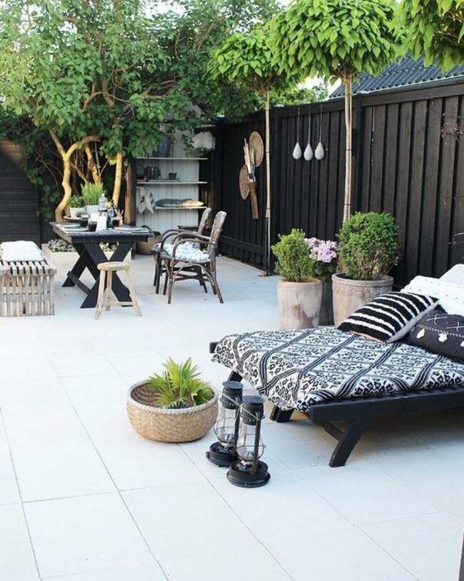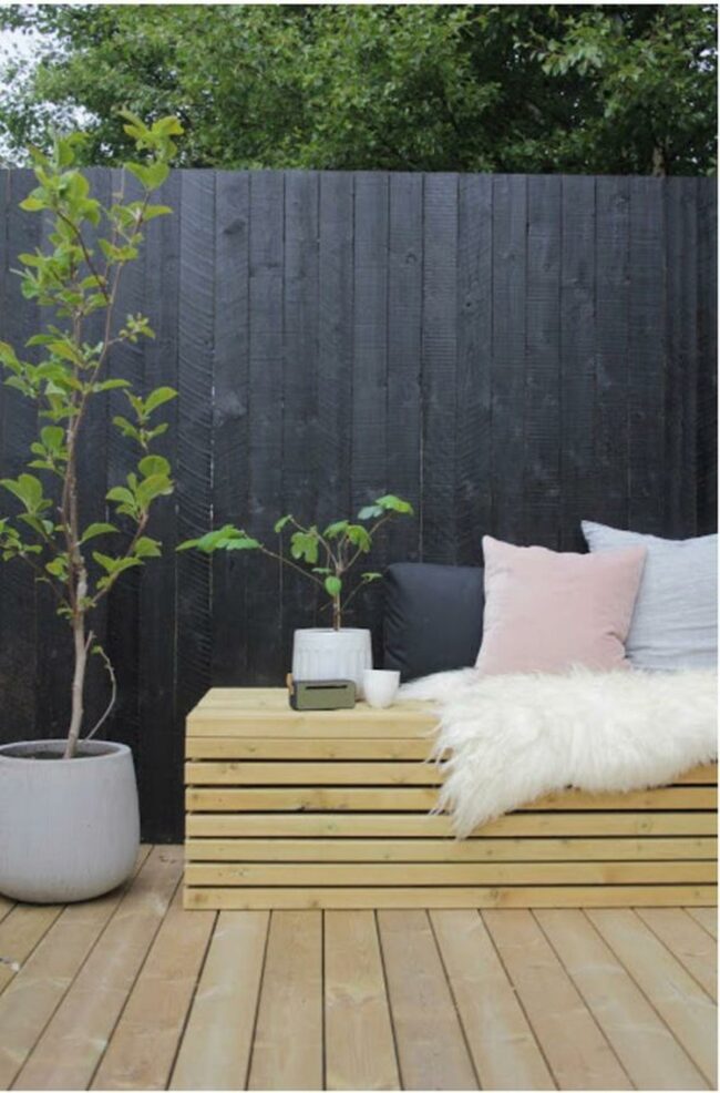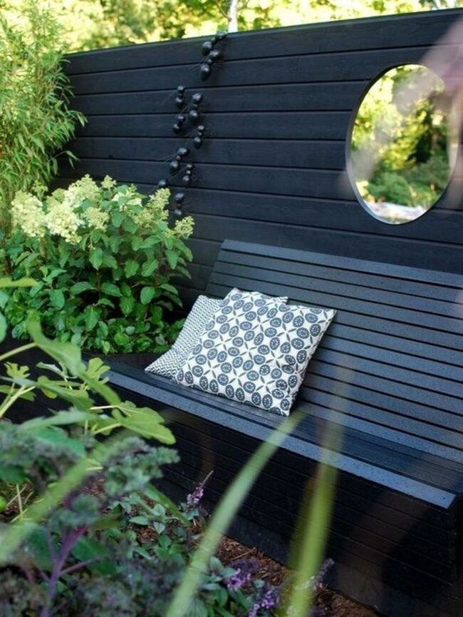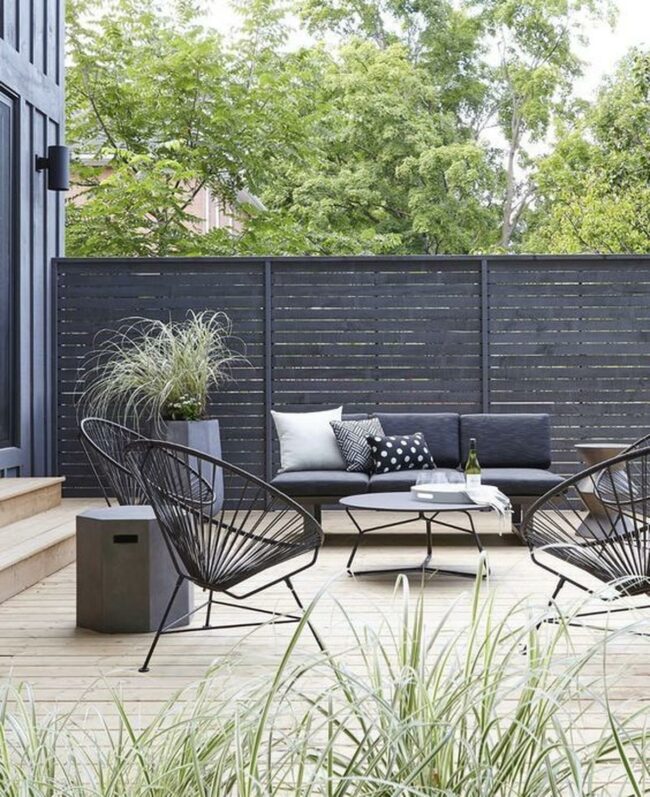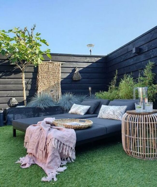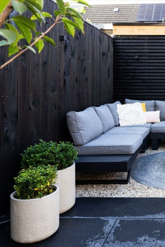 Dark gray wooden fencing adds a modern backdrop to this outdoor retreat, while lush green plants and small shrubs create a natural border at its base.