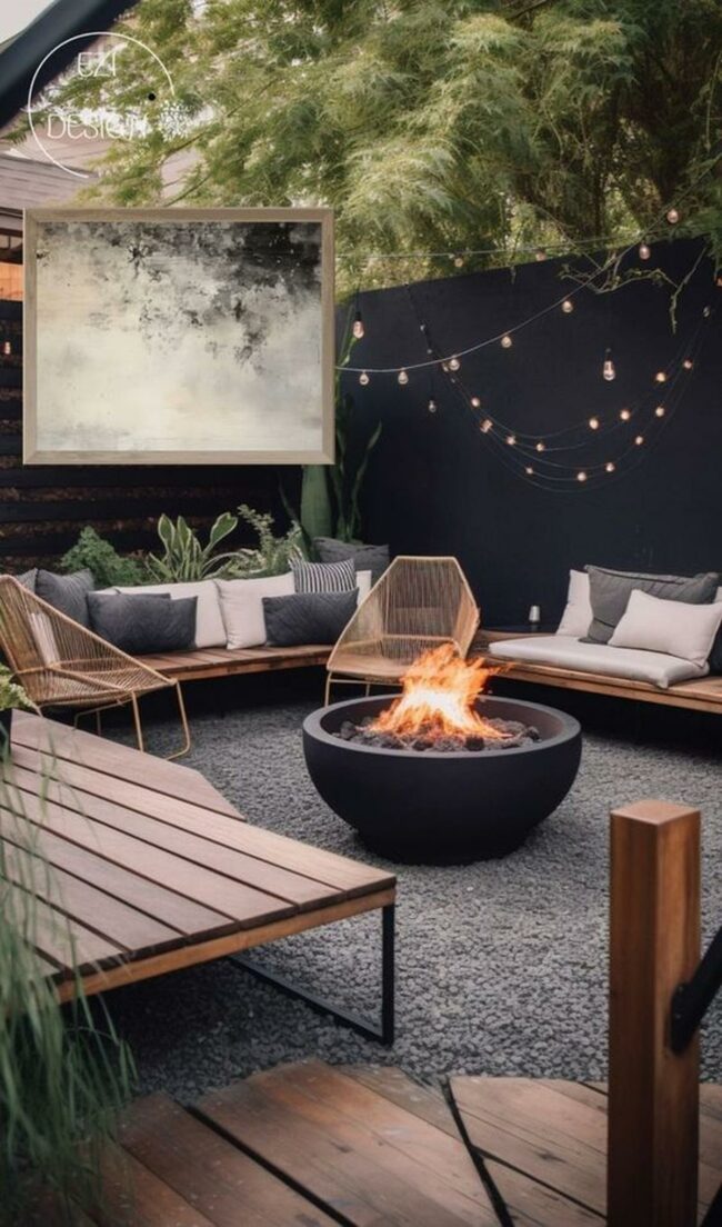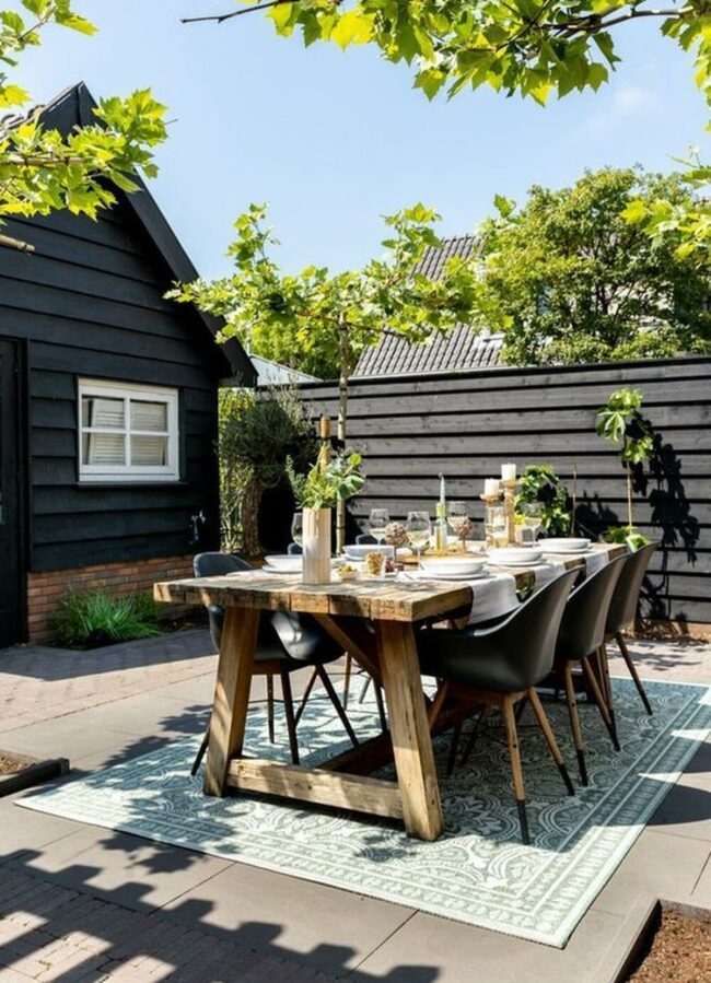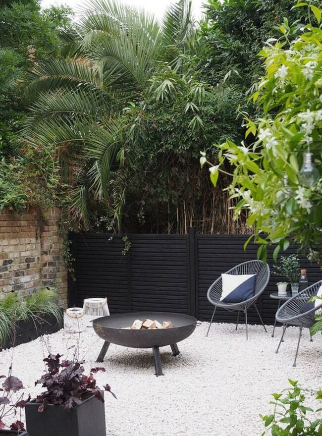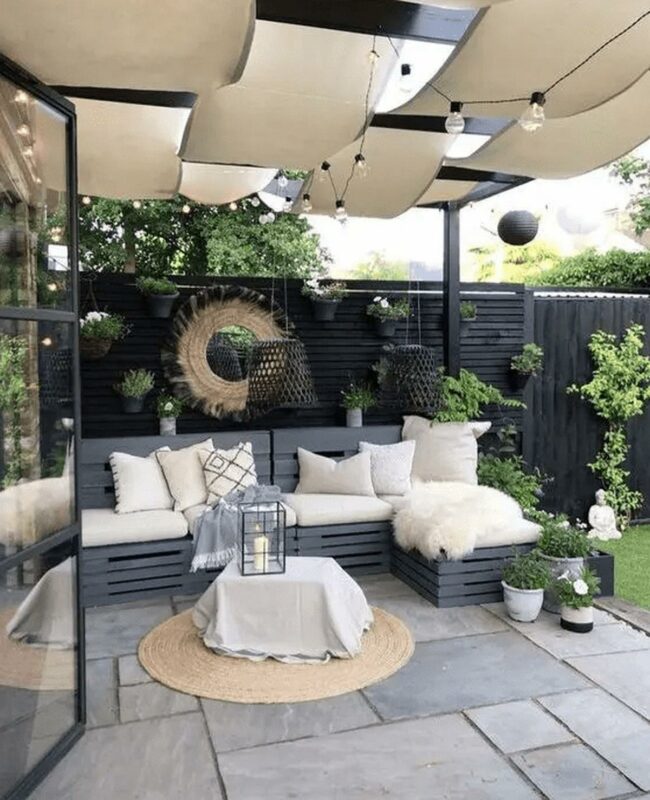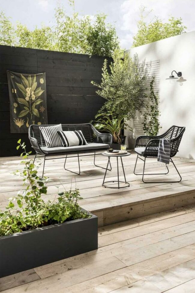 Dark gray wooden fencing adds a modern backdrop to this outdoor retreat, while lush green plants and small shrubs create a natural border at its base.