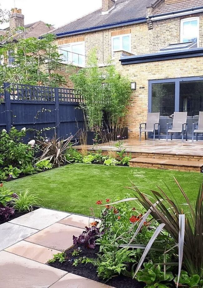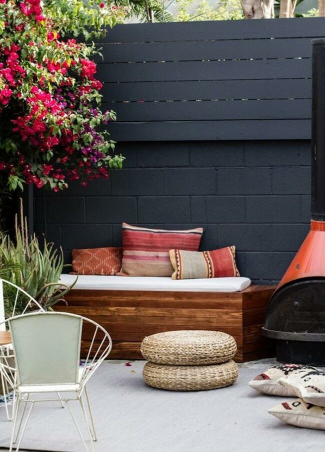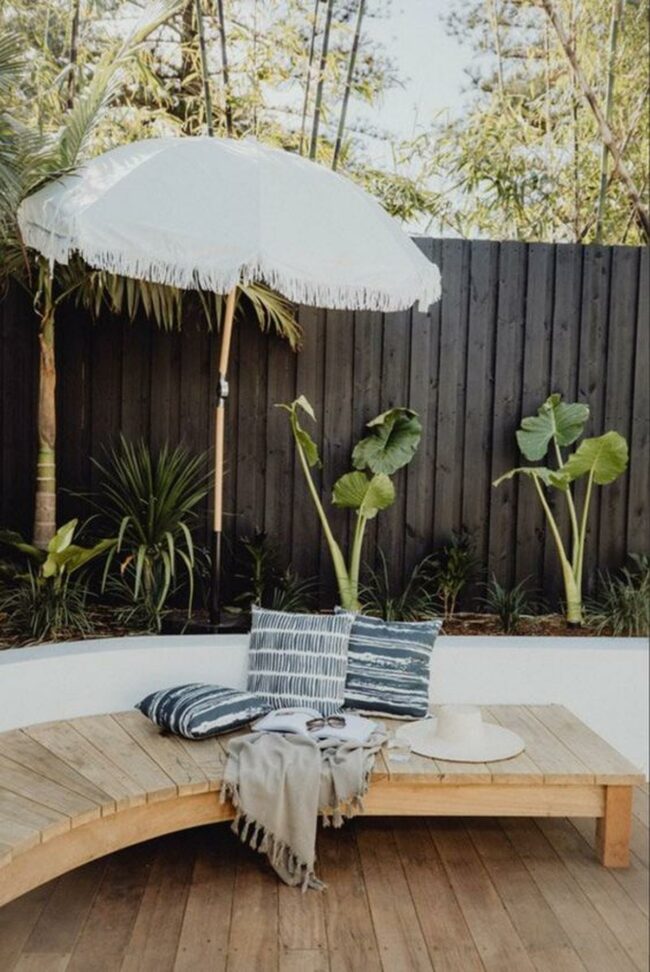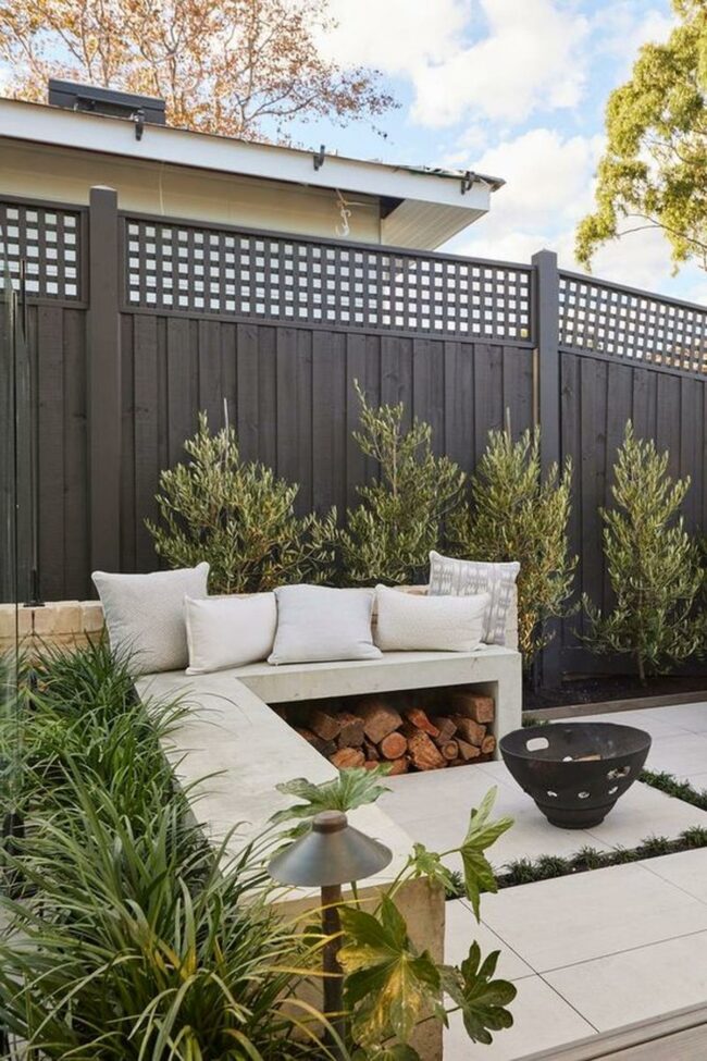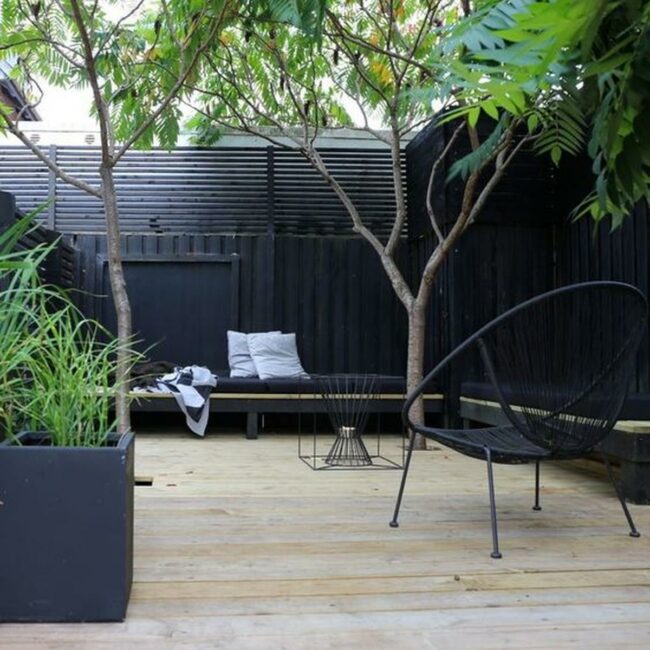 Dark wooden fencing provides a perfect backdrop while ensuring privacy in this well-designed sanctuary.
