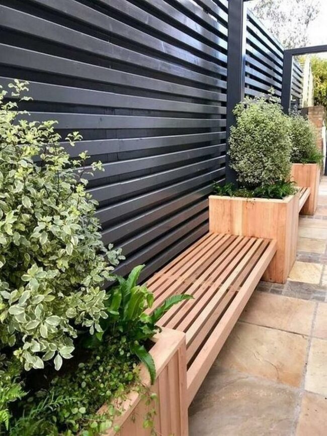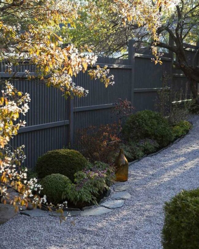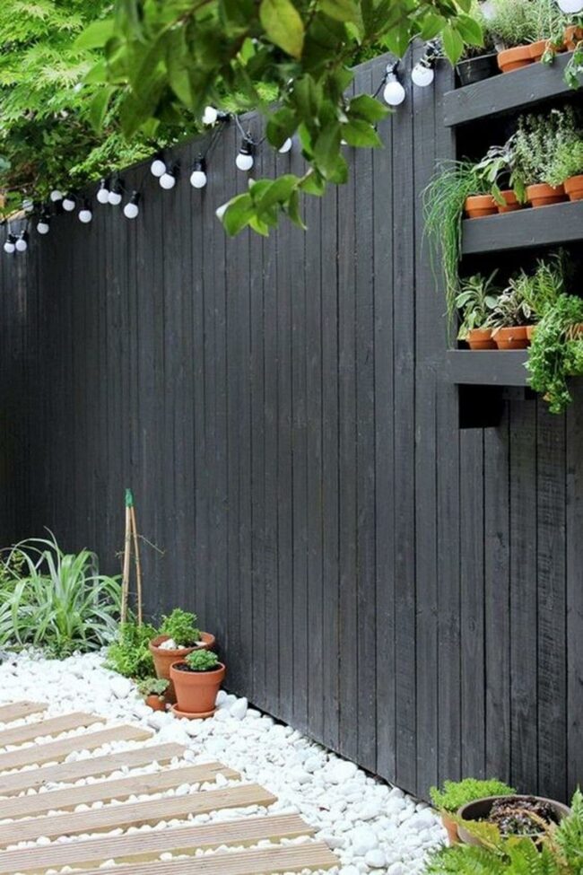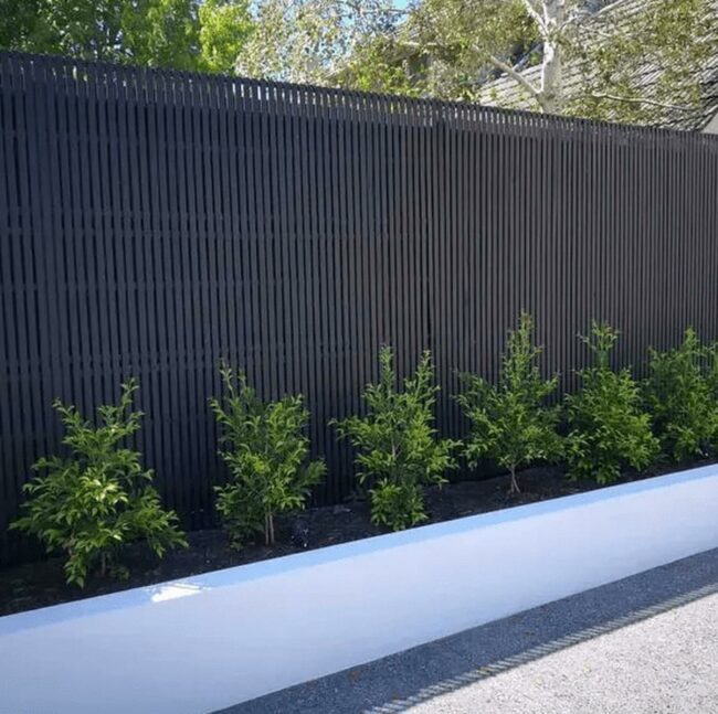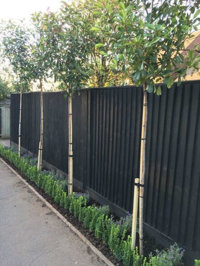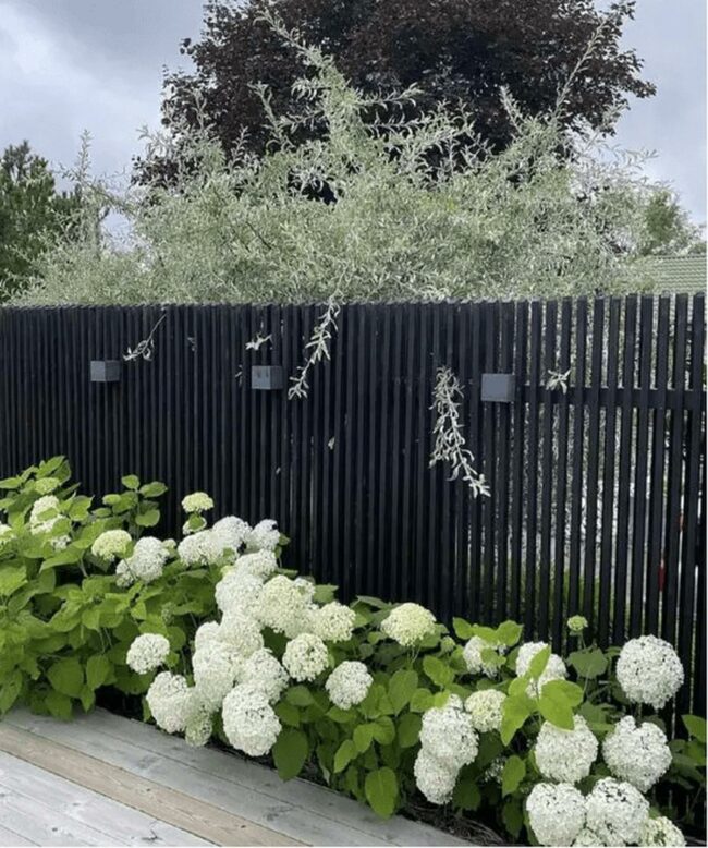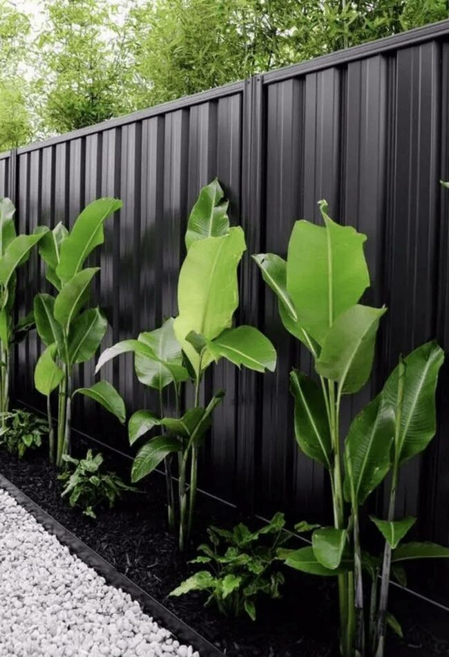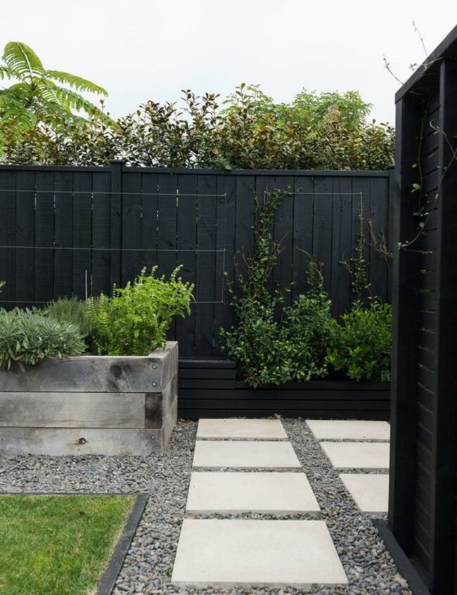Black wooden fences provide a contemporary backdrop that makes the greenery pop visually against the dark contrast.