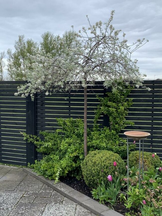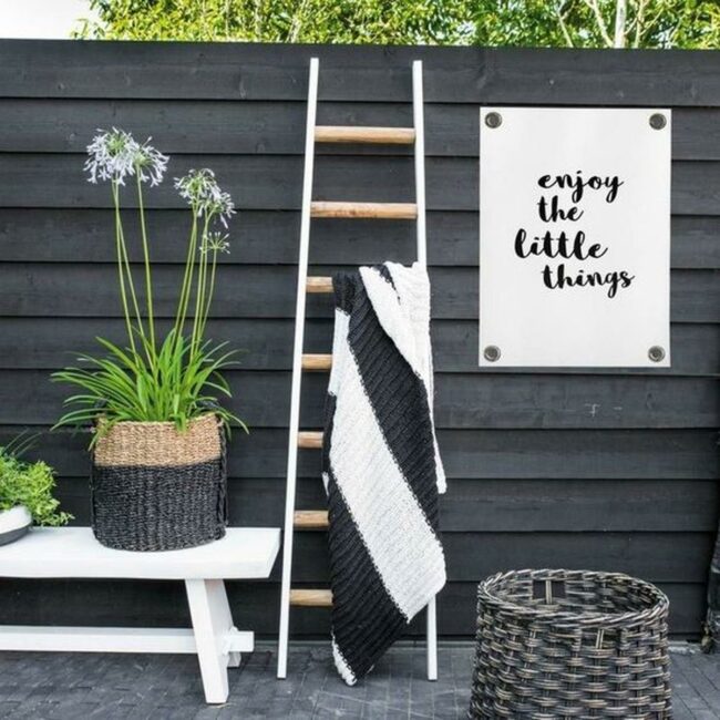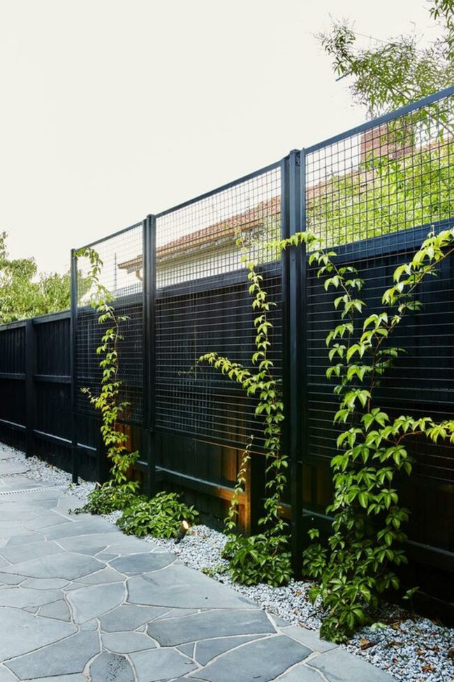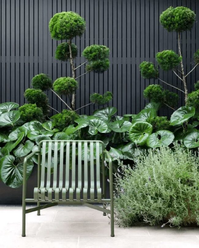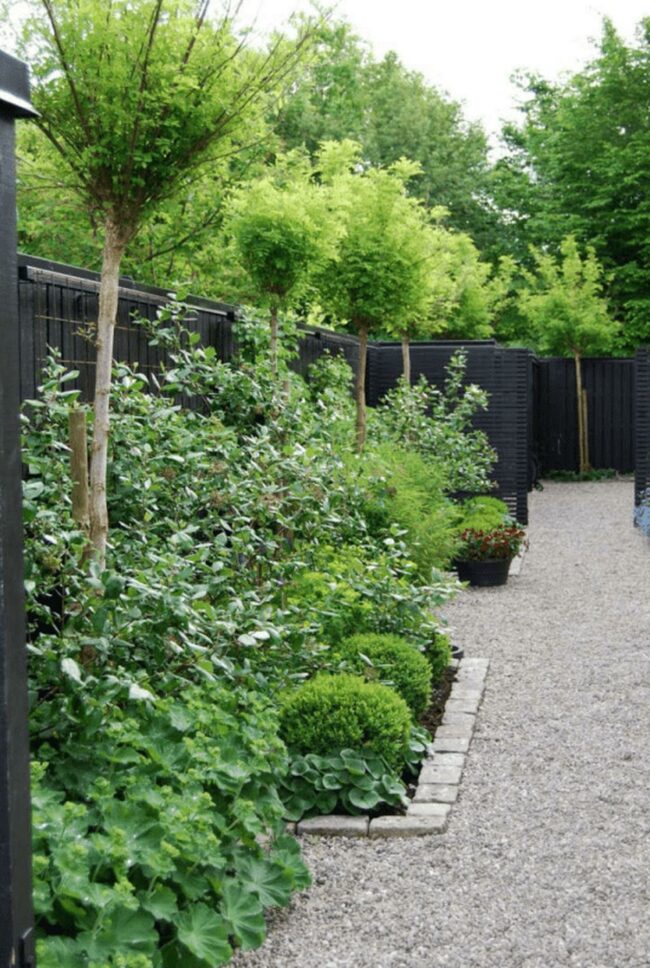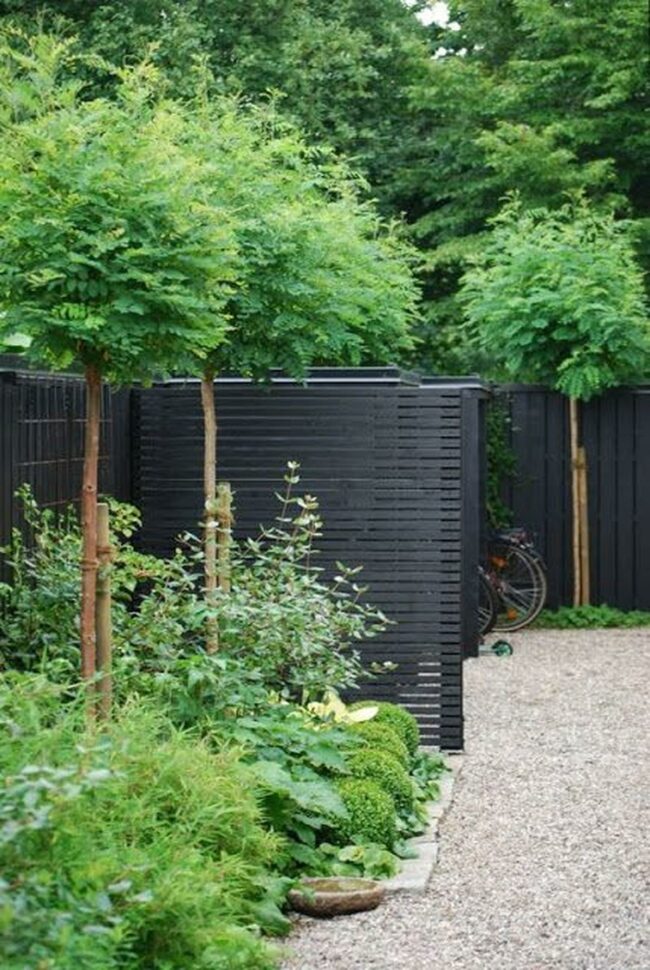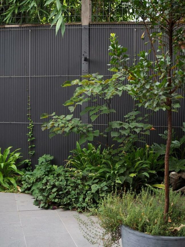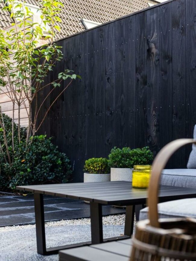 Black wooden fences provide a contemporary backdrop that makes the greenery pop visually against the dark contrast.