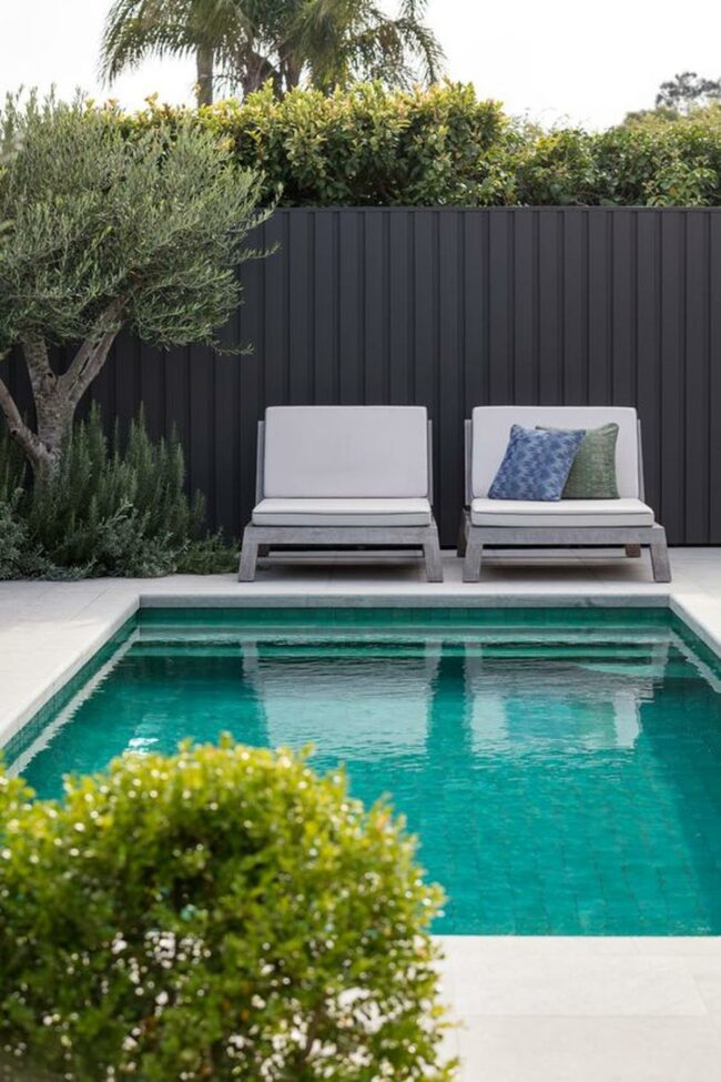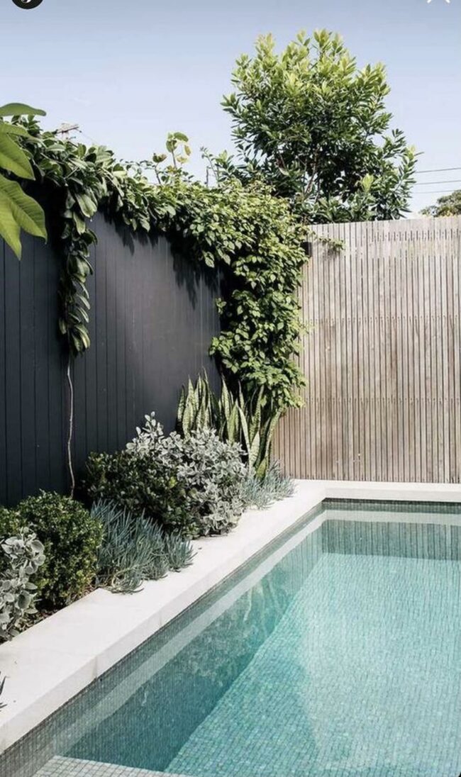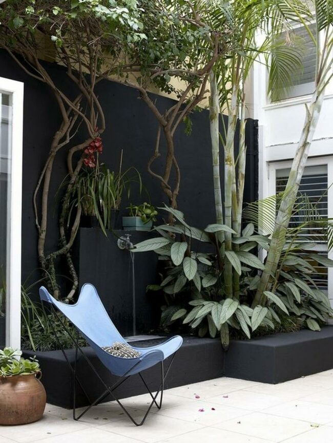Cool greenery stands tall against the dark fence, bringing a sense of nature right to this backyard sanctuary.