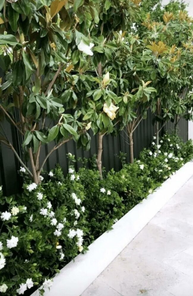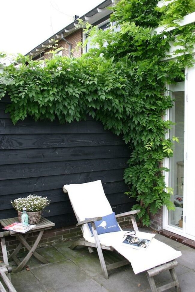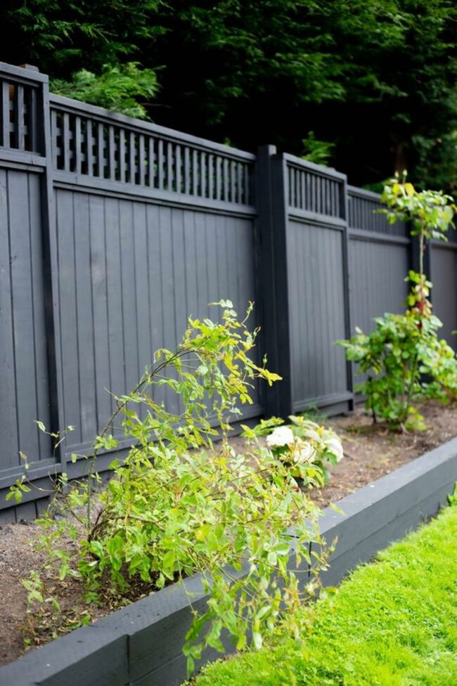 The dark fence offers privacy while creating a beautiful backdrop that makes the plants pop with color.
