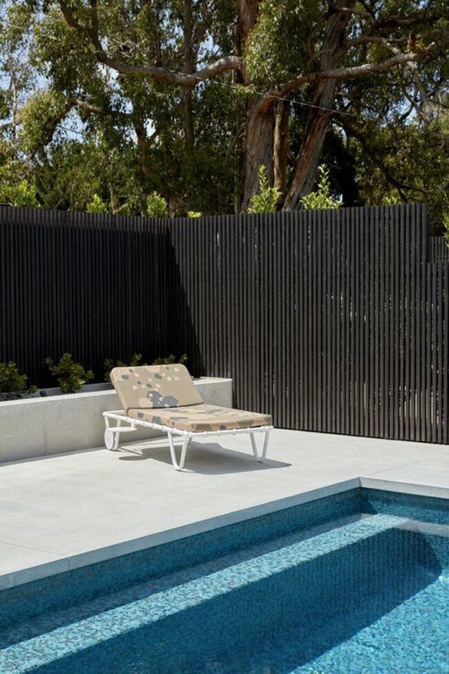 Smooth wooden decking underfoot echoes the fence design, bringing harmony to the entire space.