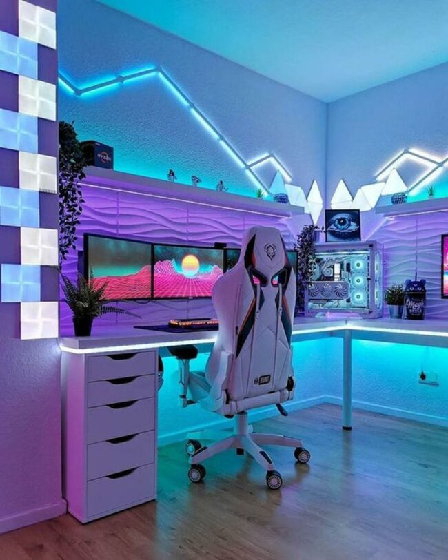 The entire room shows how lighting and thoughtful design can turn a simple space into an amazing gaming experience.