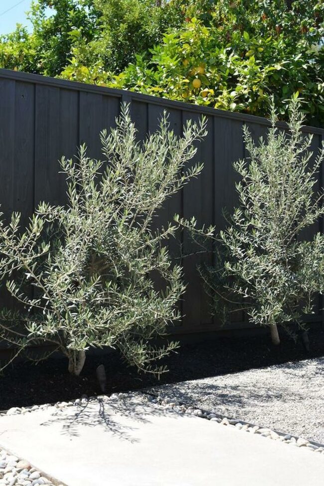 Side by side against a tall, dark wooden fence, two small olive trees create a peaceful focal point in this serene outdoor area.