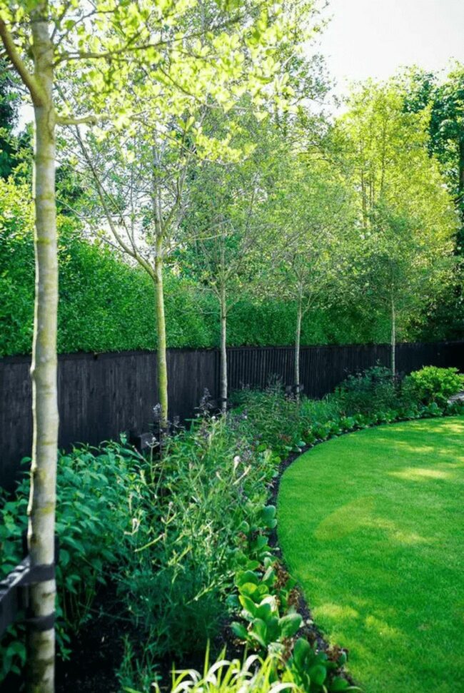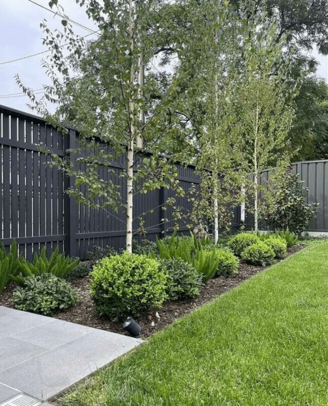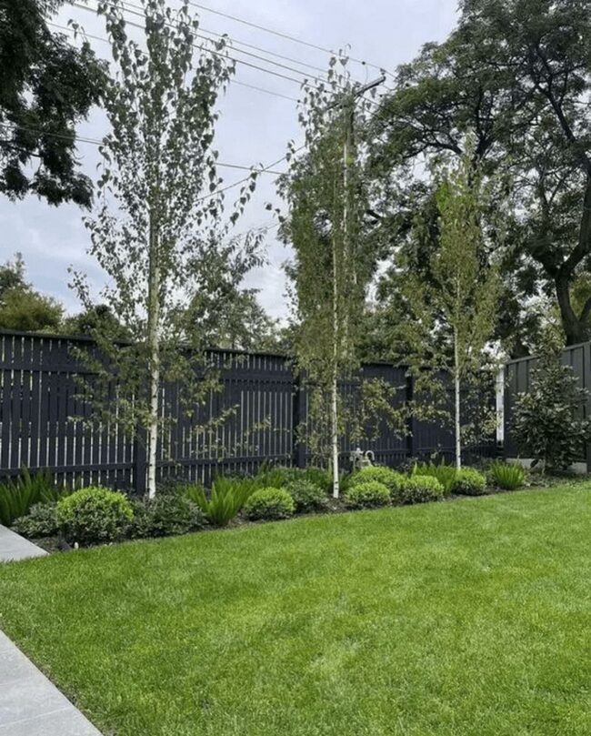 Clean lines of light-trunked trees stand gracefully against the striking black wooden fence, creating a perfect natural backdrop for any yard.