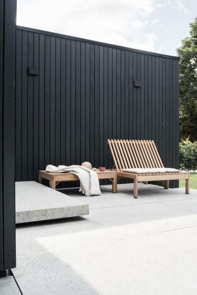 Gorgeous dark vertical wood panels create a minimalist backdrop for this peaceful outdoor retreat where a natural wood lounge chair sits perfectly beside its matching low table.