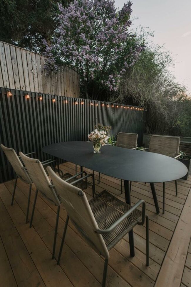 Our amazing backyard deck features a long black oval table surrounded by four stylish chairs with slim frames.