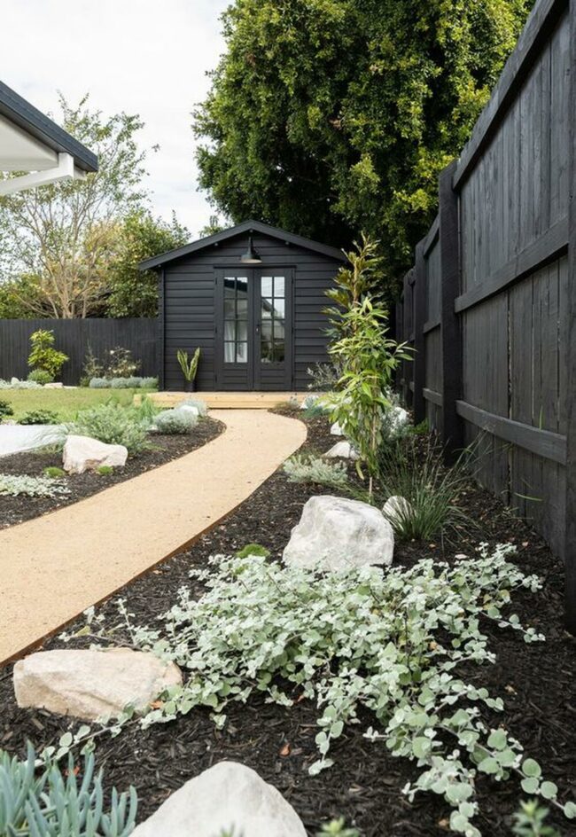 This charming black shed with glass doors serves as the destination point for a winding garden path that creates an inviting journey through the outdoor space.