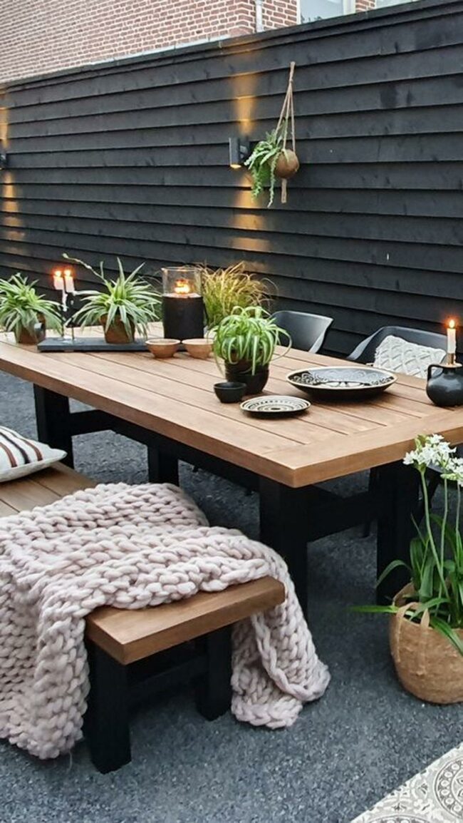 Dinner parties under the stars become magical in this charming outdoor setup with its rustic wooden table surrounded by matching benches.
