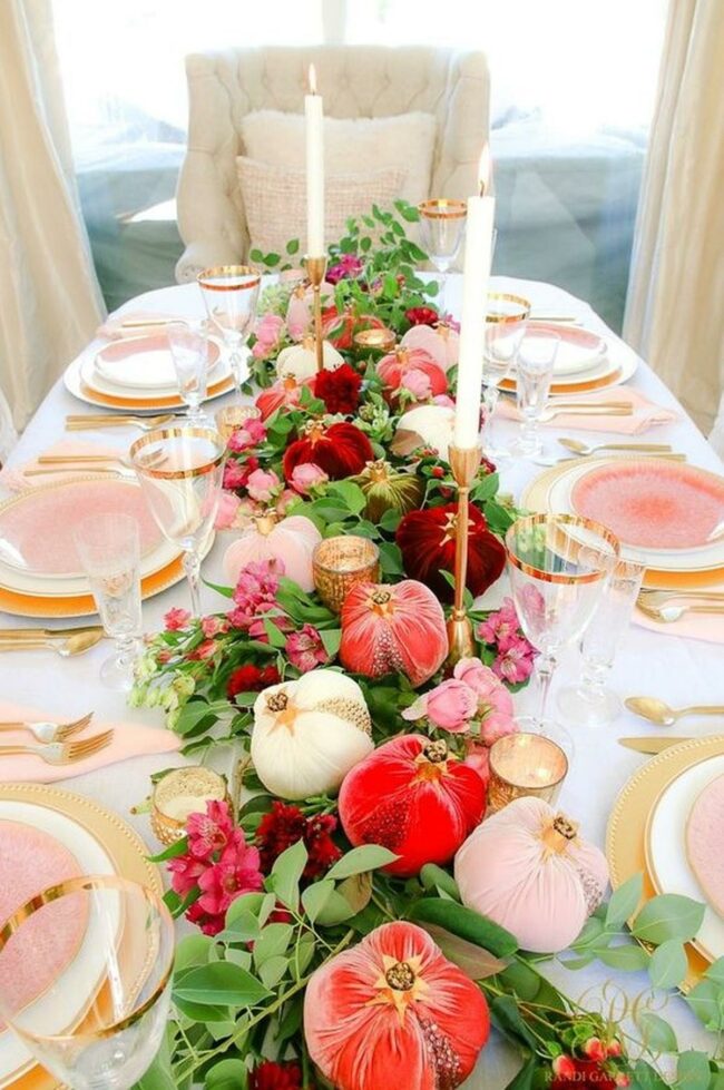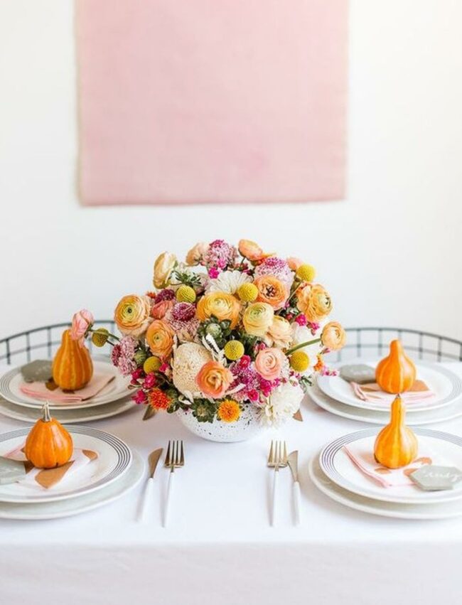 Fall dining becomes magical with pink, white, and orange pumpkins scattered across the table alongside fresh flower arrangements nestled among green foliage.
