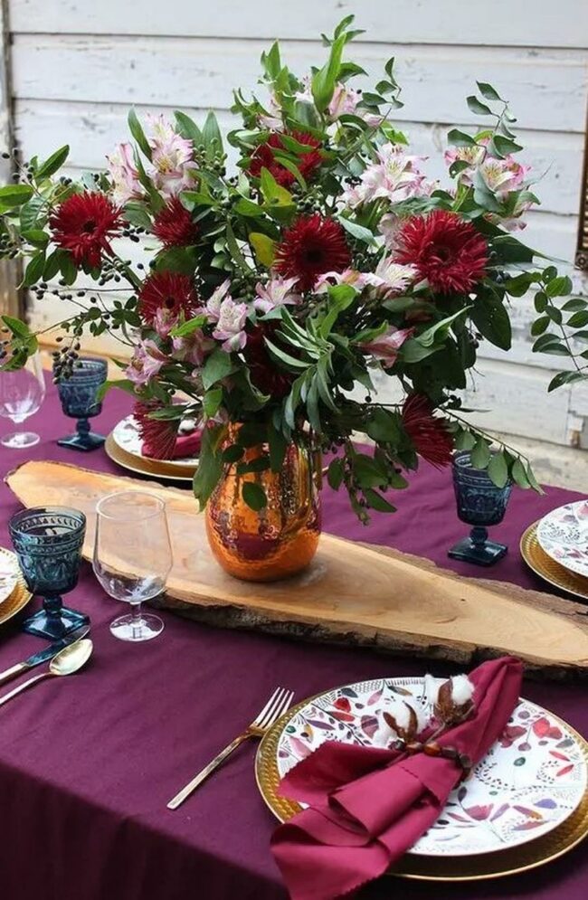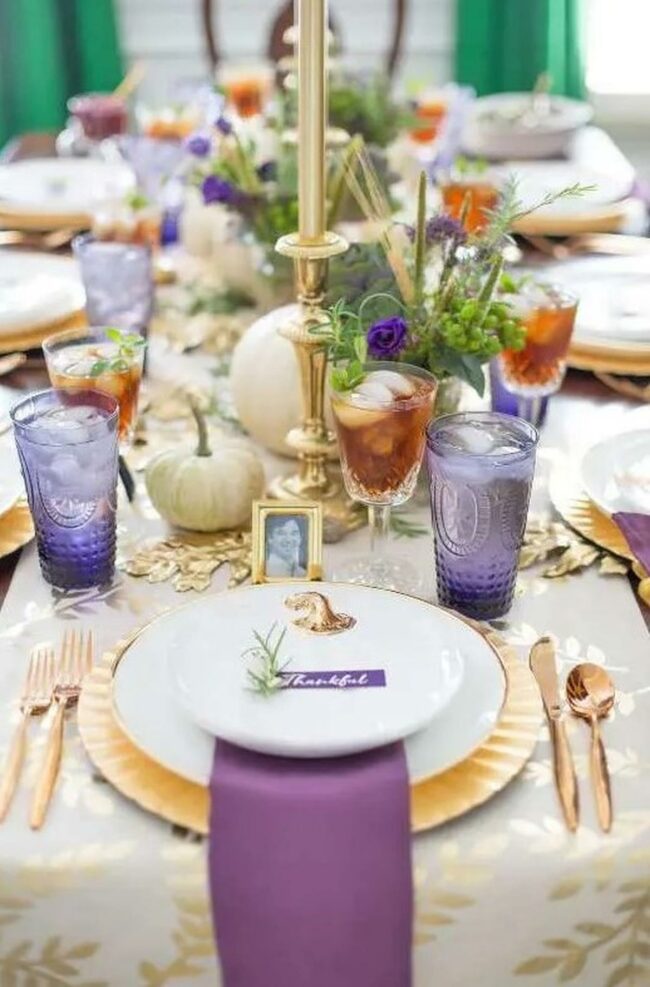 Tall purple candles in golden holders add dimension to the arrangement while casting a warm glow across the entire setting.
