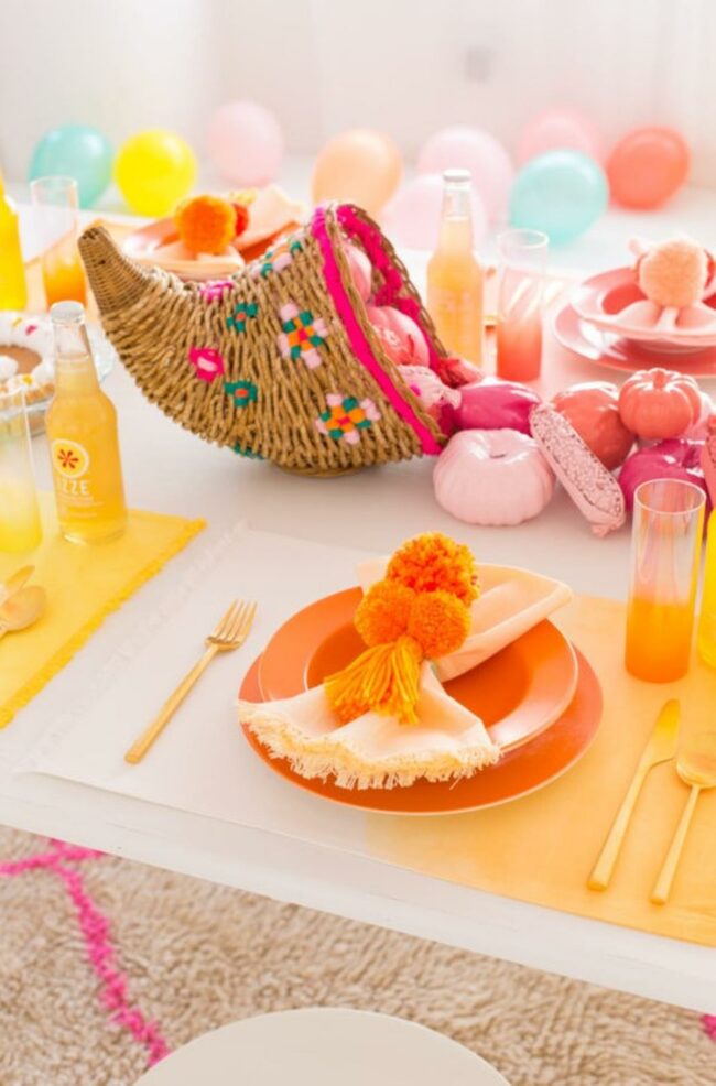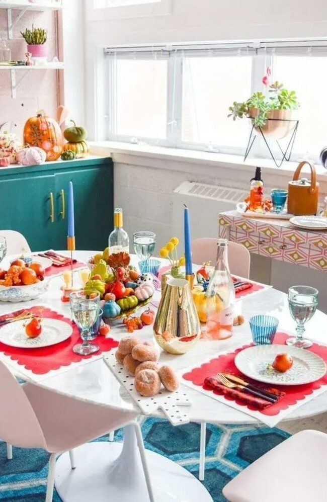 Small pumpkins and fruit arrangements dot the tabletop, creating a lively, welcoming atmosphere.