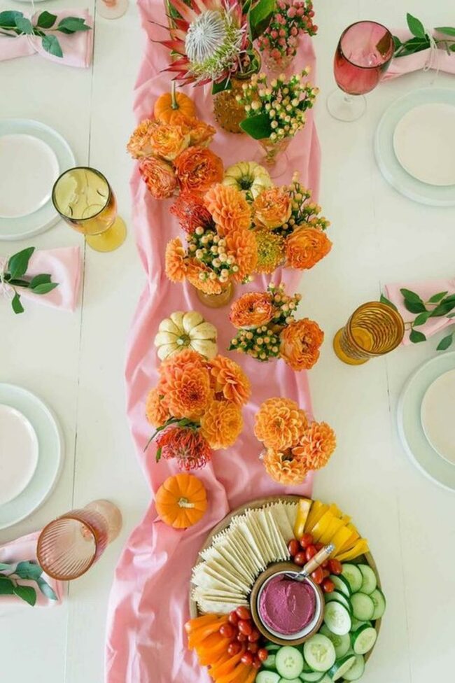 Orange flowers dance down the center of a pink tablecloth, creating a cheerful focal point that draws everyone to gather around.