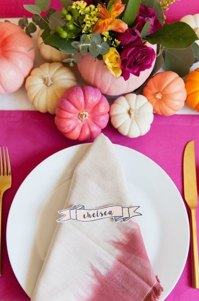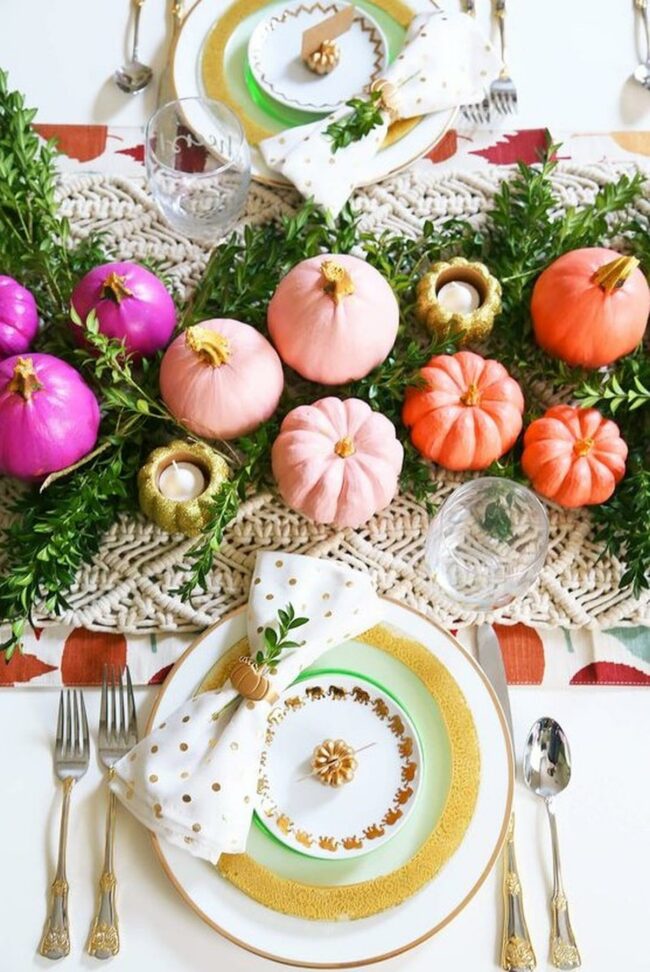 Pink, orange, and purple pumpkins create a colorful centerpiece on this charming table, surrounded by elegant gold-trimmed plates that catch the eye immediately.