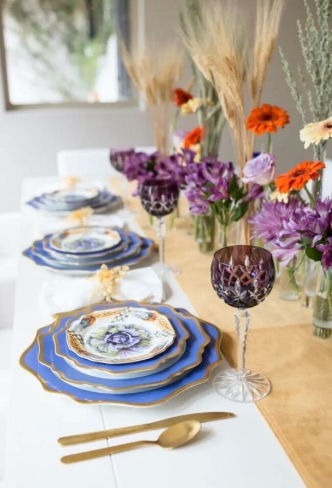 Rich blue and gold plates create a stunning centerpiece on this welcoming table, perfectly complemented by elegant purple goblets at each setting.