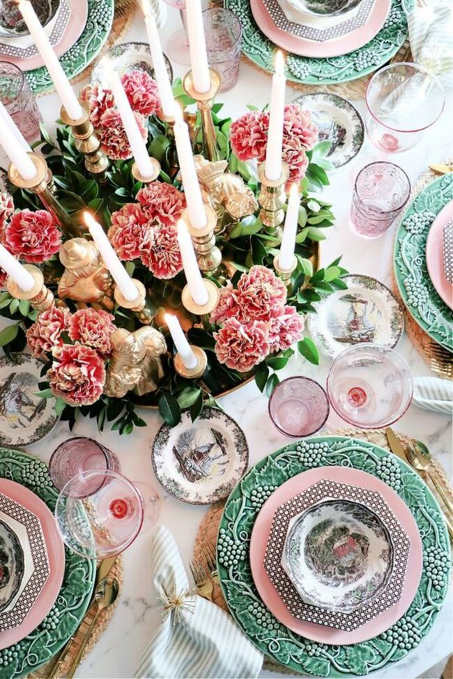 Tall silver candleholders topped with pink candles stand proudly in the center, surrounded by touches of greenery that bring life to the arrangement.