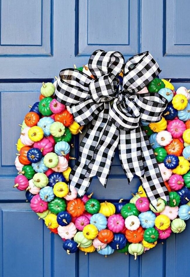 Cheerful mini pumpkins in various colors create a lively wreath that pops against its calming blue door backdrop.