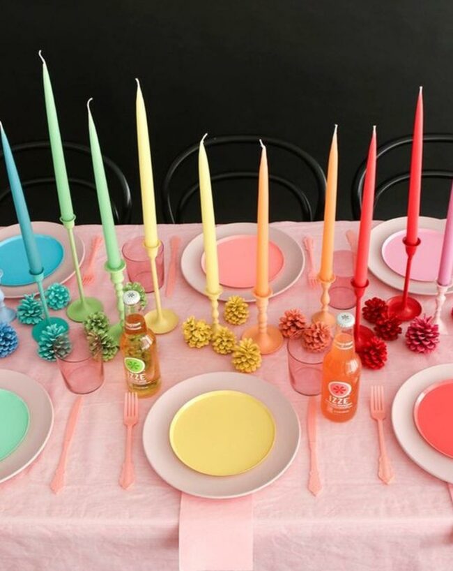 Wooden holders showcase candles in gentle pastel tones that run down the center of the table.