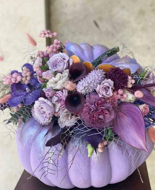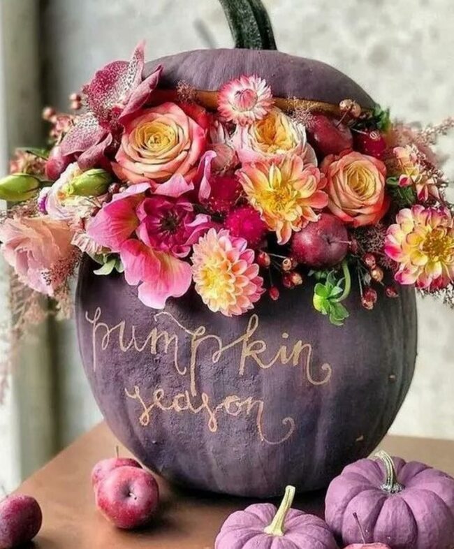 Purple pumpkins make delightful vases, especially when filled with cheerful pink, yellow, and peach blooms like this eye-catching centerpiece.