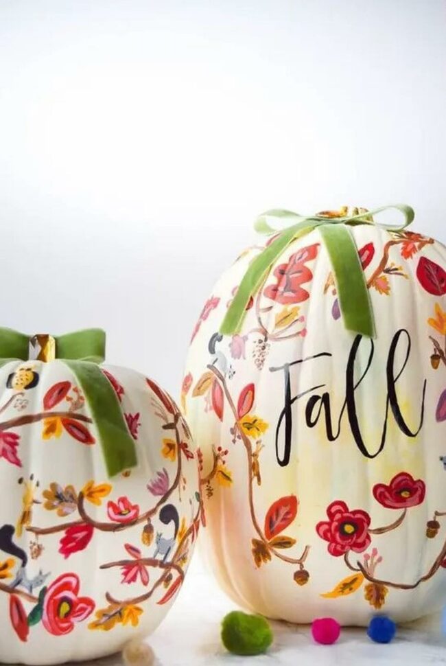 Anyone can recreate this look with painted pumpkins and fresh or silk flowers from local craft stores.