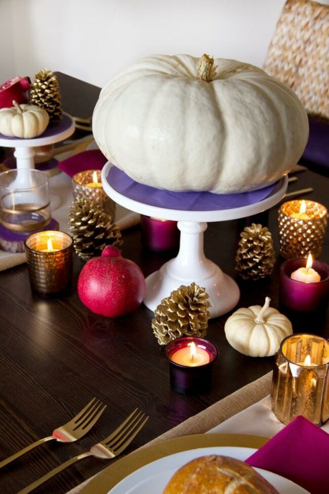 A majestic white pumpkin takes center stage on a cake stand, perfectly complemented by its smaller counterparts and golden pinecones that catch the light beautifully.