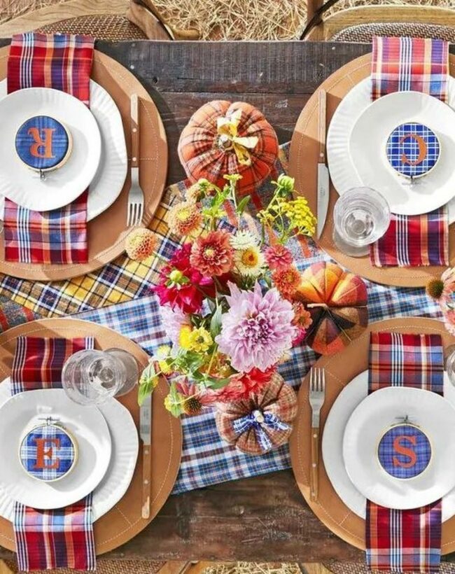 Checkered tablecloths in warm orange, red and green tones create an eye-catching foundation for this inviting dining setup.