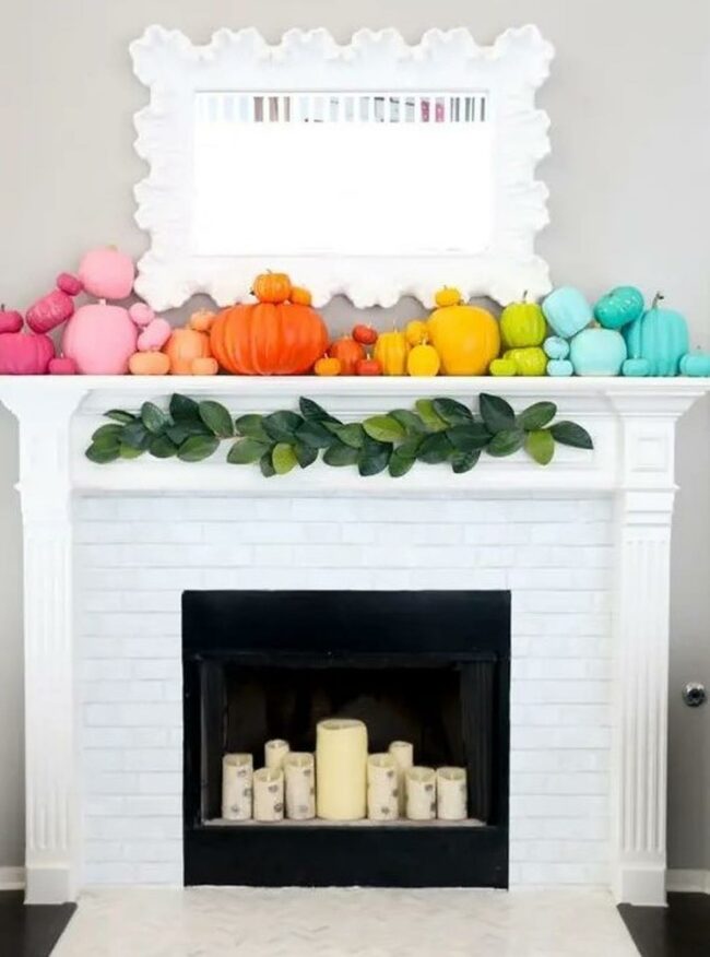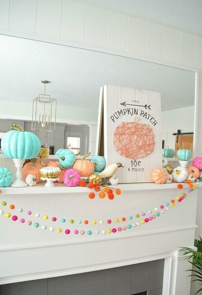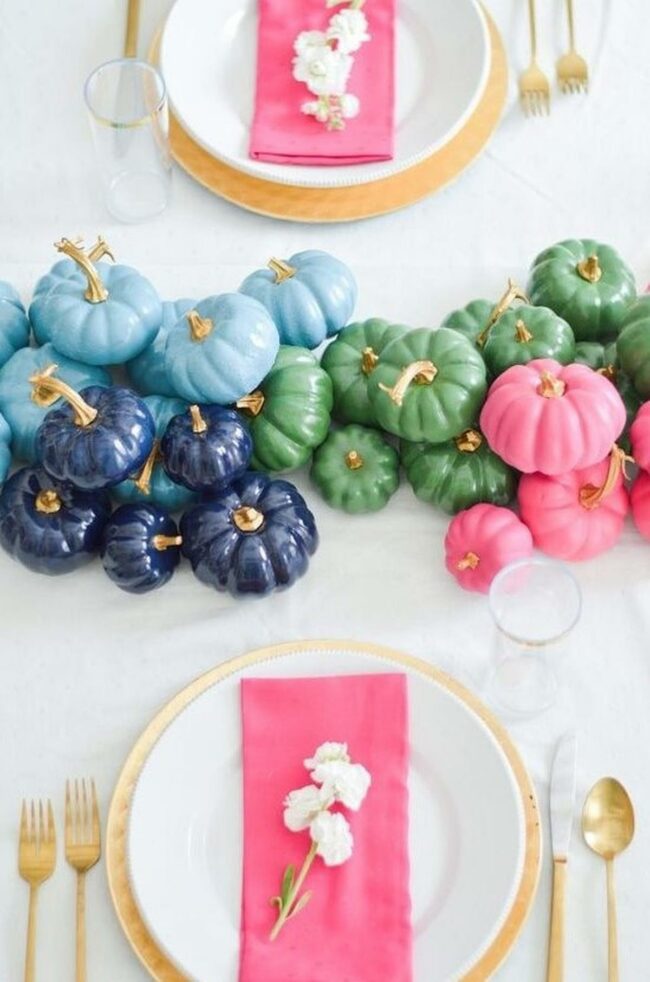 Colorful pumpkins in blue, green, and pink form a playful centerpiece that runs down the middle, creating a seasonal focal point without overwhelming the space.