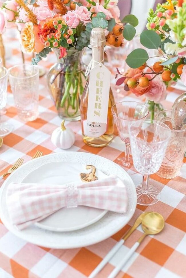 Cute orange pumpkins mark each spot at the table, adding a playful fall element that makes everyone feel welcome.