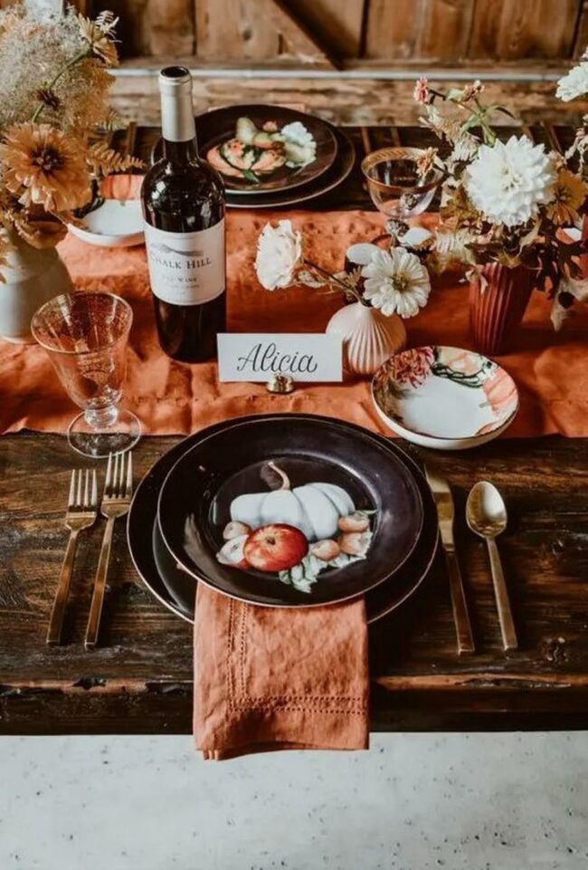 Fall warmth radiates from this charming dining table through orange napkins and a matching runner that welcome everyone to gather around.