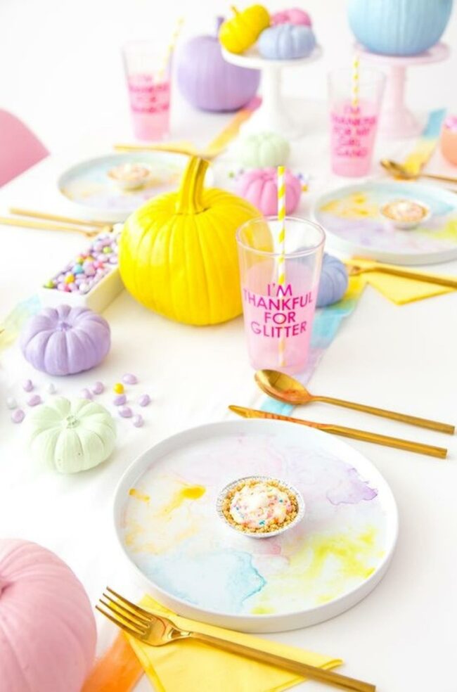 Cheerful pastel pumpkins in yellow, lavender, pink, and mint green create a delightful centerpiece for this happy table arrangement.