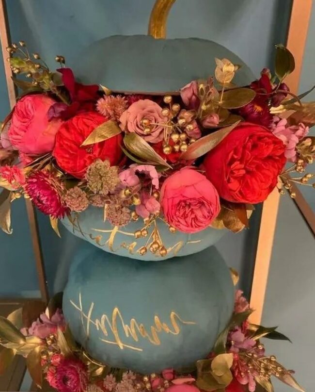 These stacked blue pumpkins with elegant gold cursive writing create a stunning fall centerpiece that catches everyone's eye.