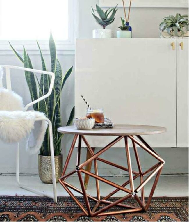 The stand-out coffee table catches eyes with its copper geometric base and smooth circular top that perfectly holds drinks and small decorative bowls.