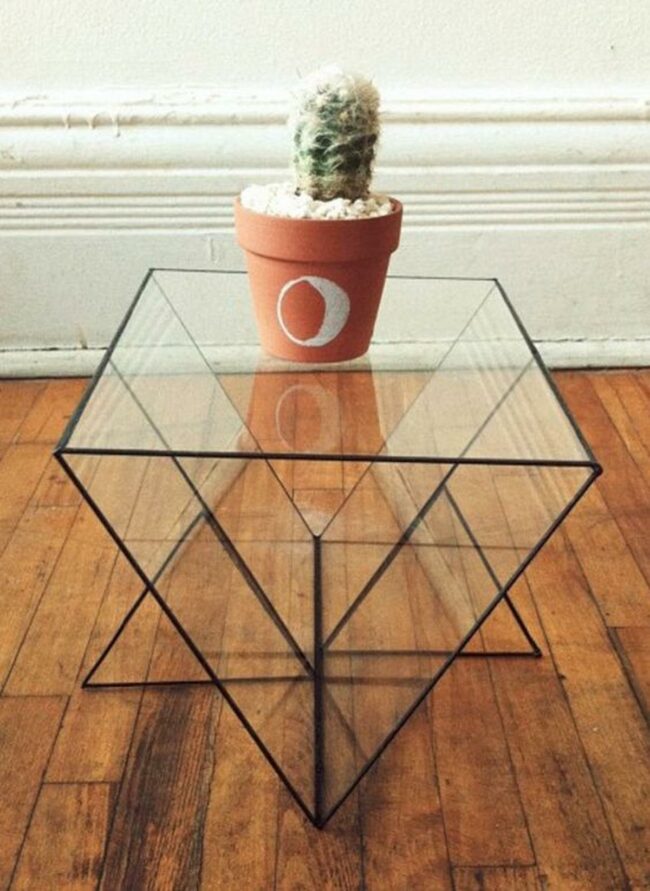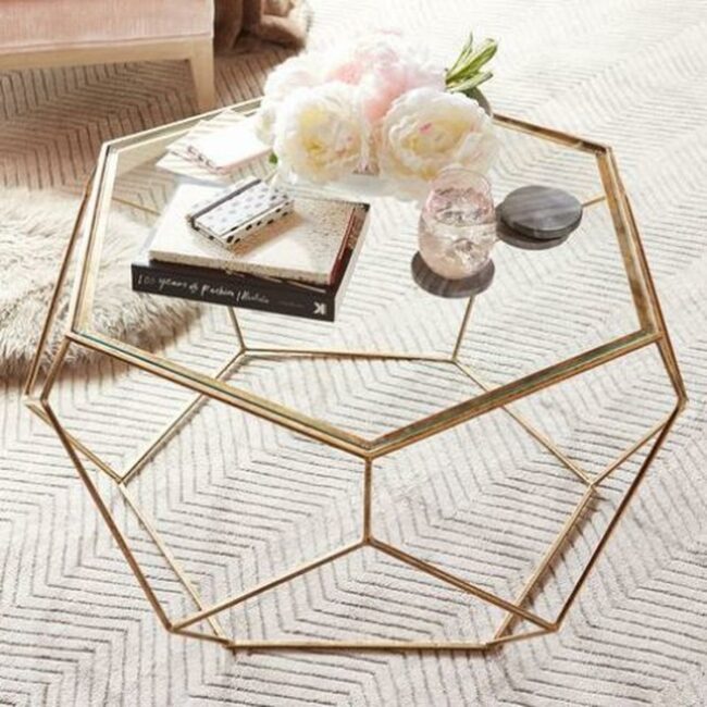 Modern rooms come alive with a clear glass table featuring an eye-catching geometric metal frame as the standout piece.