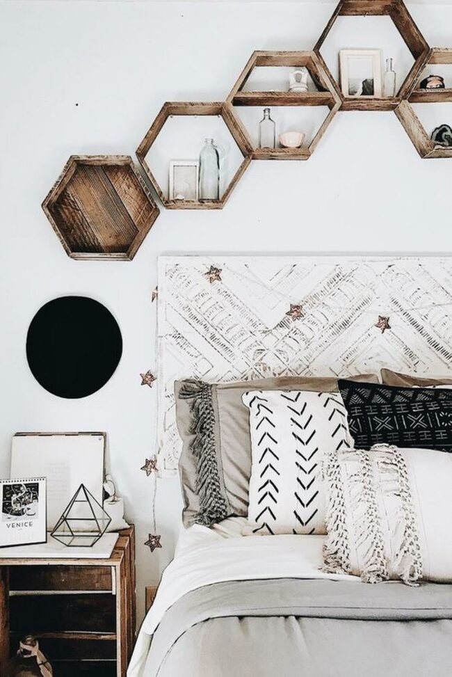 Wooden hexagon shelves stand out against the white wall, displaying small glass bottles and decorative items that show off your personal style.
