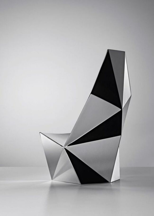 Sharp geometric angles define this paper-inspired chair with its eye-catching contrast of metallic silver and deep black triangles.