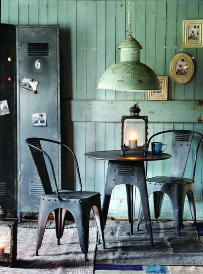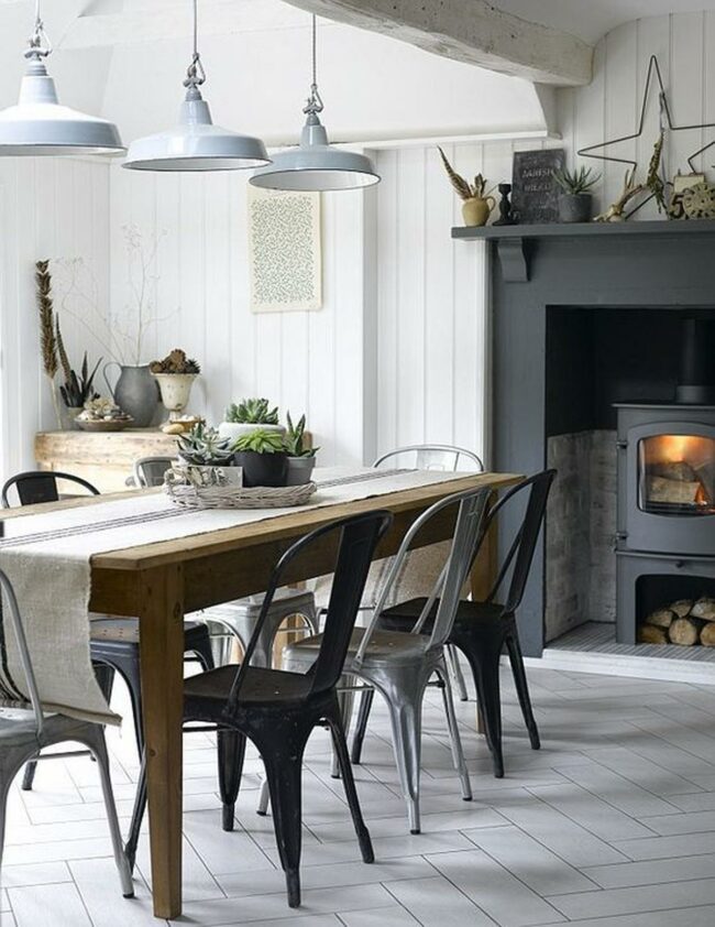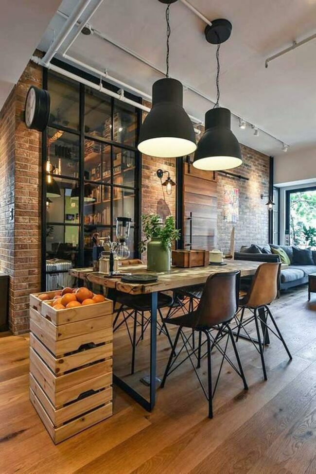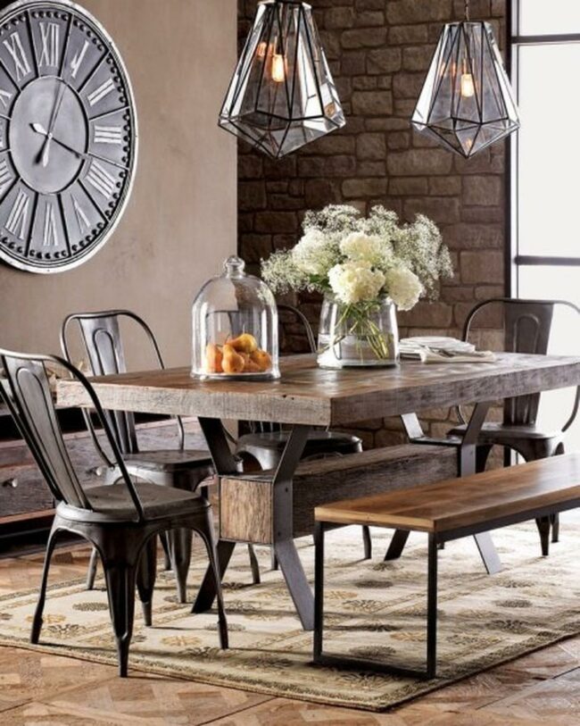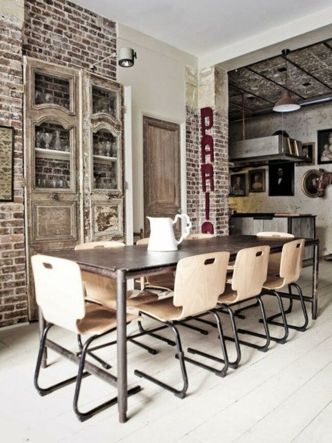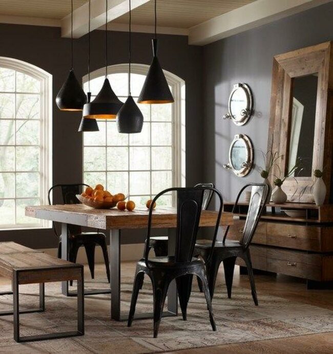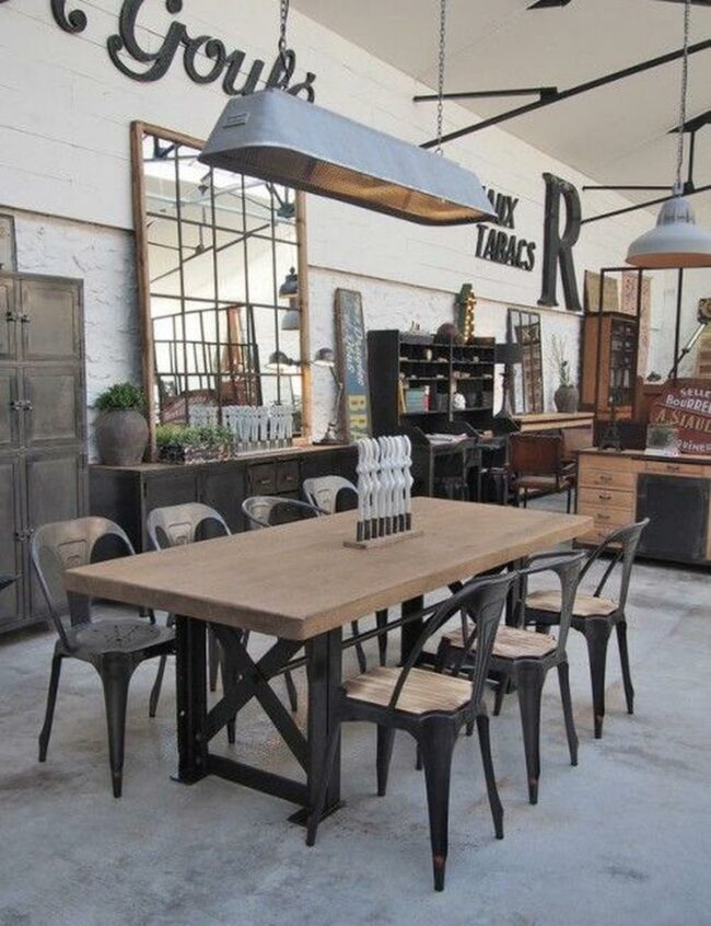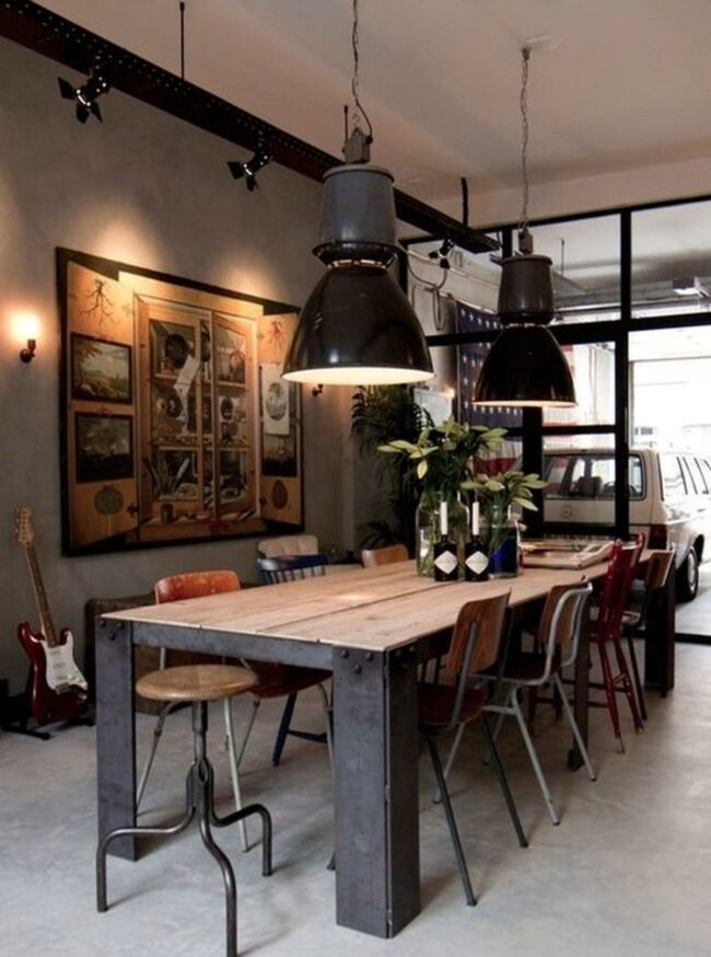 Factory-inspired lighting fixtures hanging above sturdy tables often serve as striking focal points in these distinctive eating areas.