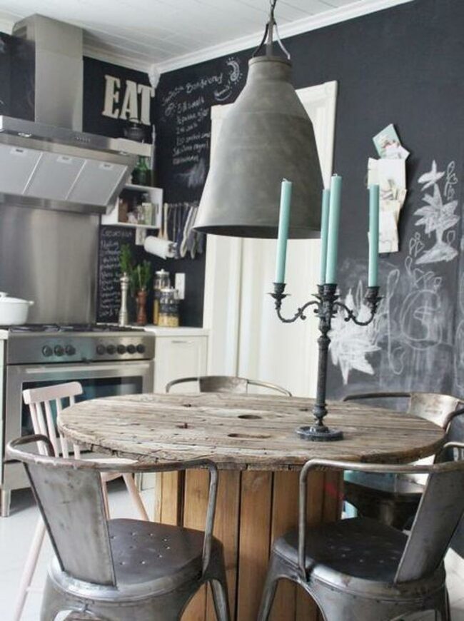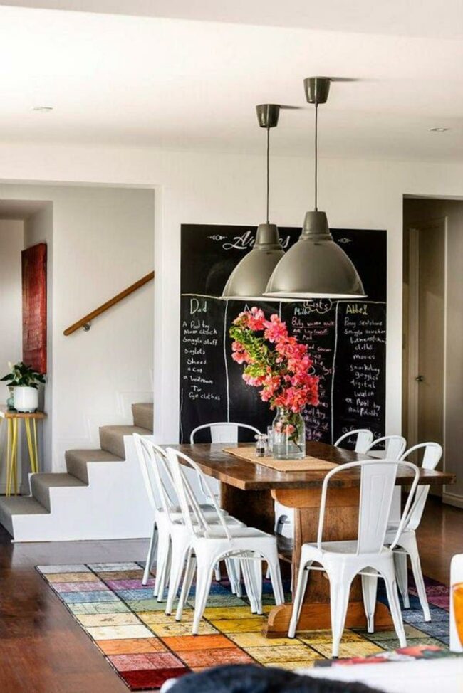 A corner chalkboard serves as both decoration and a practical spot for messages or dinner menus.
