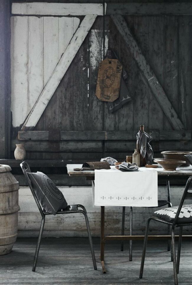 Dark wooden walls paired with vintage barn-style doors create a charming rustic atmosphere in this intimate dining space where metal chairs with patterned cushions surround a humble table adorned with a white cloth runner.