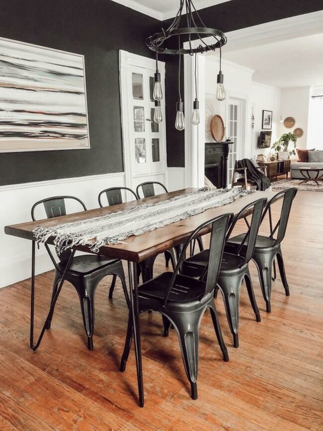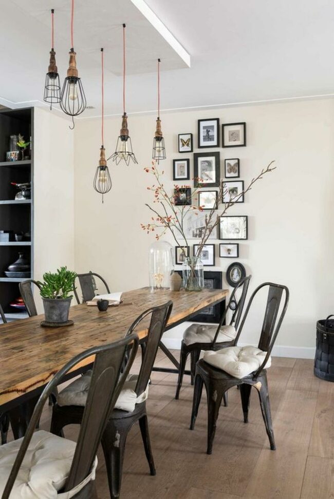 A substantial wooden table anchors the space, complemented by six metal chairs that bring an industrial edge to the room.