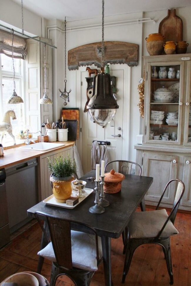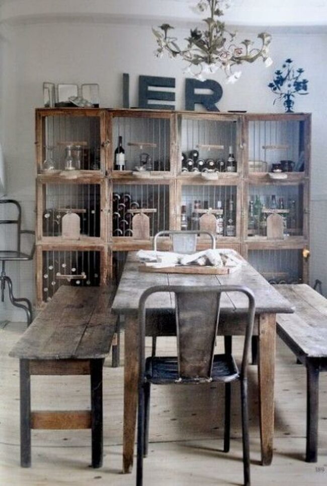 The contrast between worn wood surfaces and organized storage brings balance to this inviting eating area.