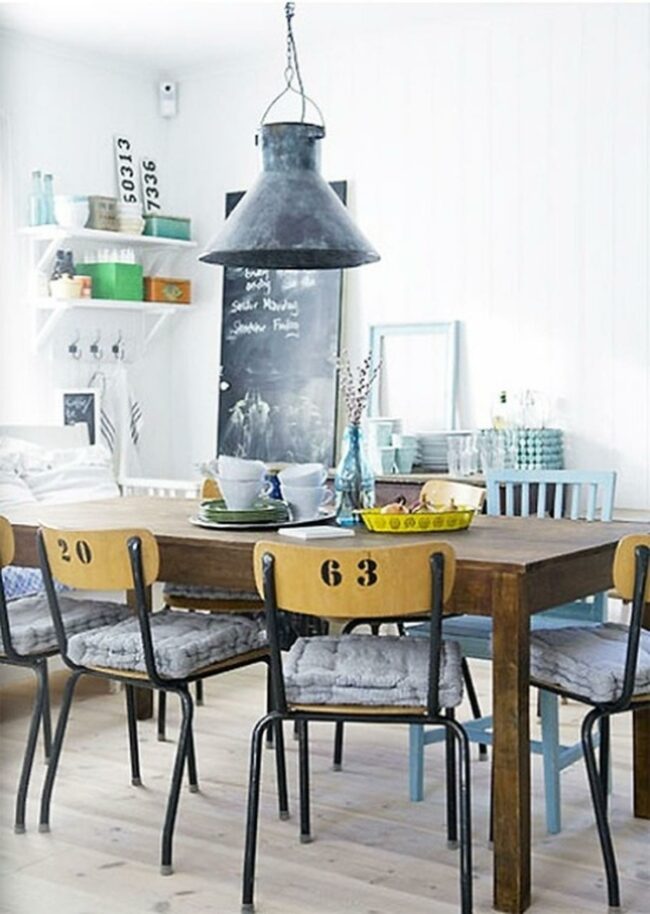Numbers painted on chair backs create a playful focal point in this relaxed dining space, where a large wooden table anchors the room with its natural charm.