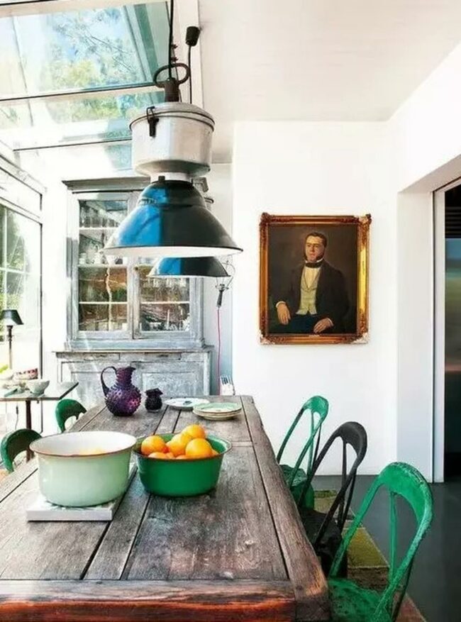 The centerpiece wooden table shows its years of character with a weathered finish, perfectly complemented by the mix of green and black chairs adding personality to the space.