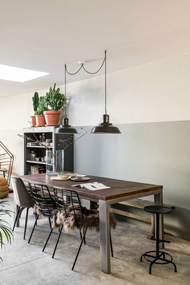Gray and white walls create a calm backdrop for shared meals or quiet work sessions under two industrial pendant lights that provide perfect illumination.