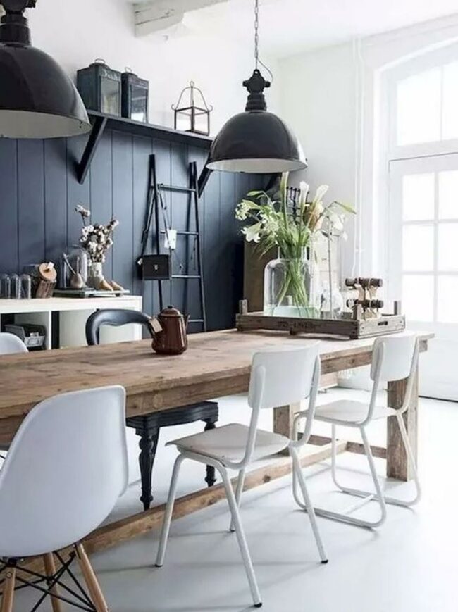Modern elegance meets rustic charm in this inviting dining space where a weathered wooden table serves as the centerpiece, complemented by crisp white chairs that create a pleasing contrast.