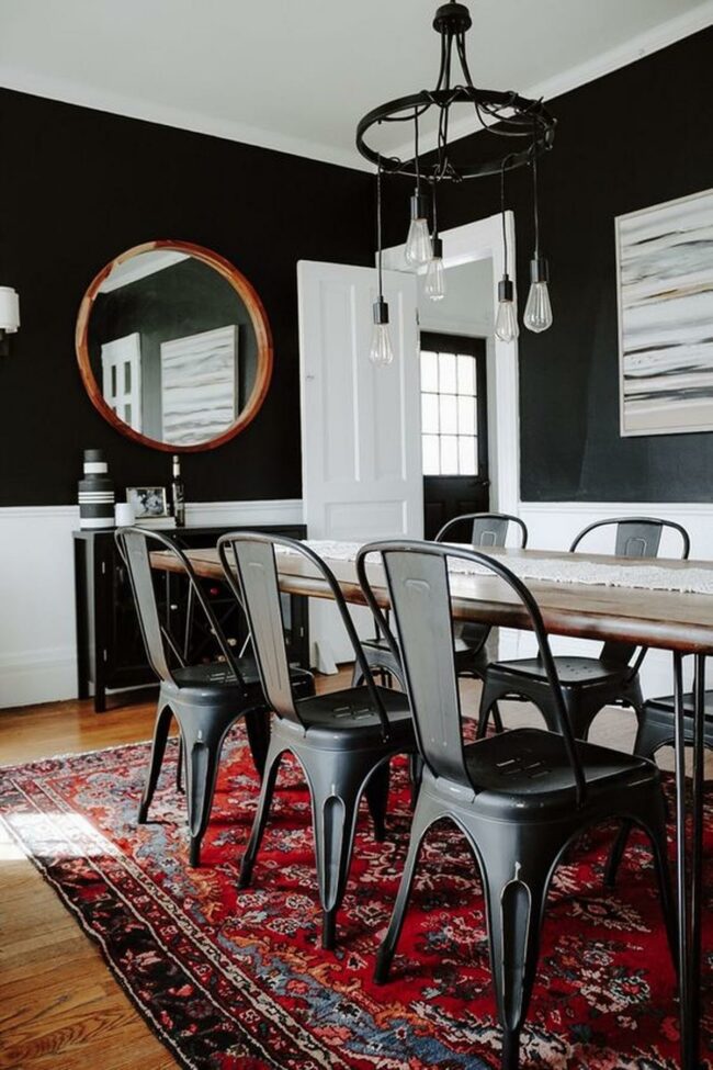 Modern elegance meets comfort in this dining area where dark wood and black metal furniture create a striking balance.