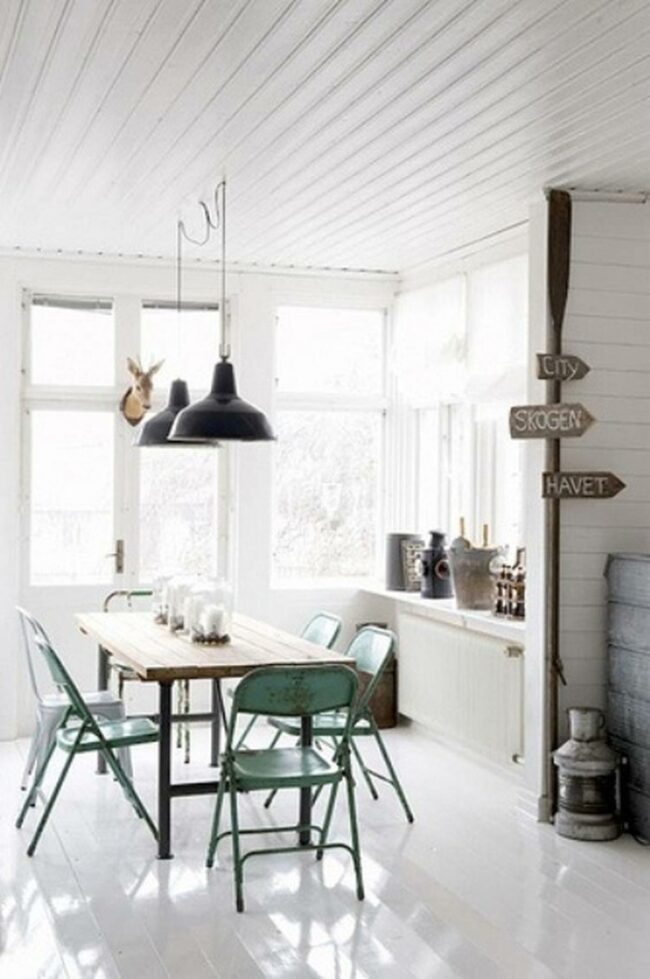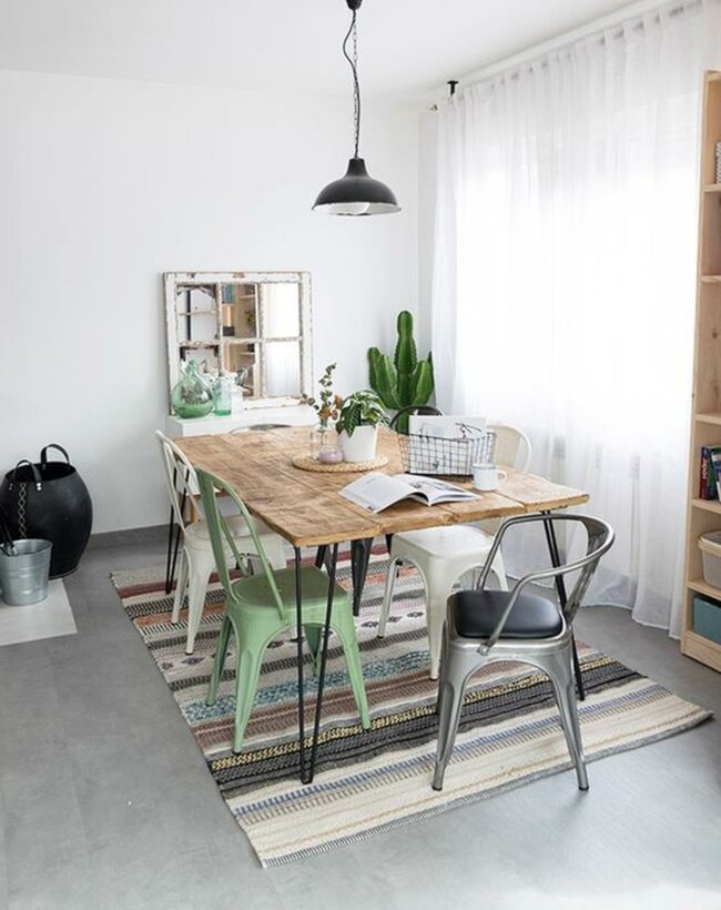 Modern dining spaces come alive when metal chairs in green, white, and black gather around a wooden table, creating an inviting atmosphere for meals with loved ones.
